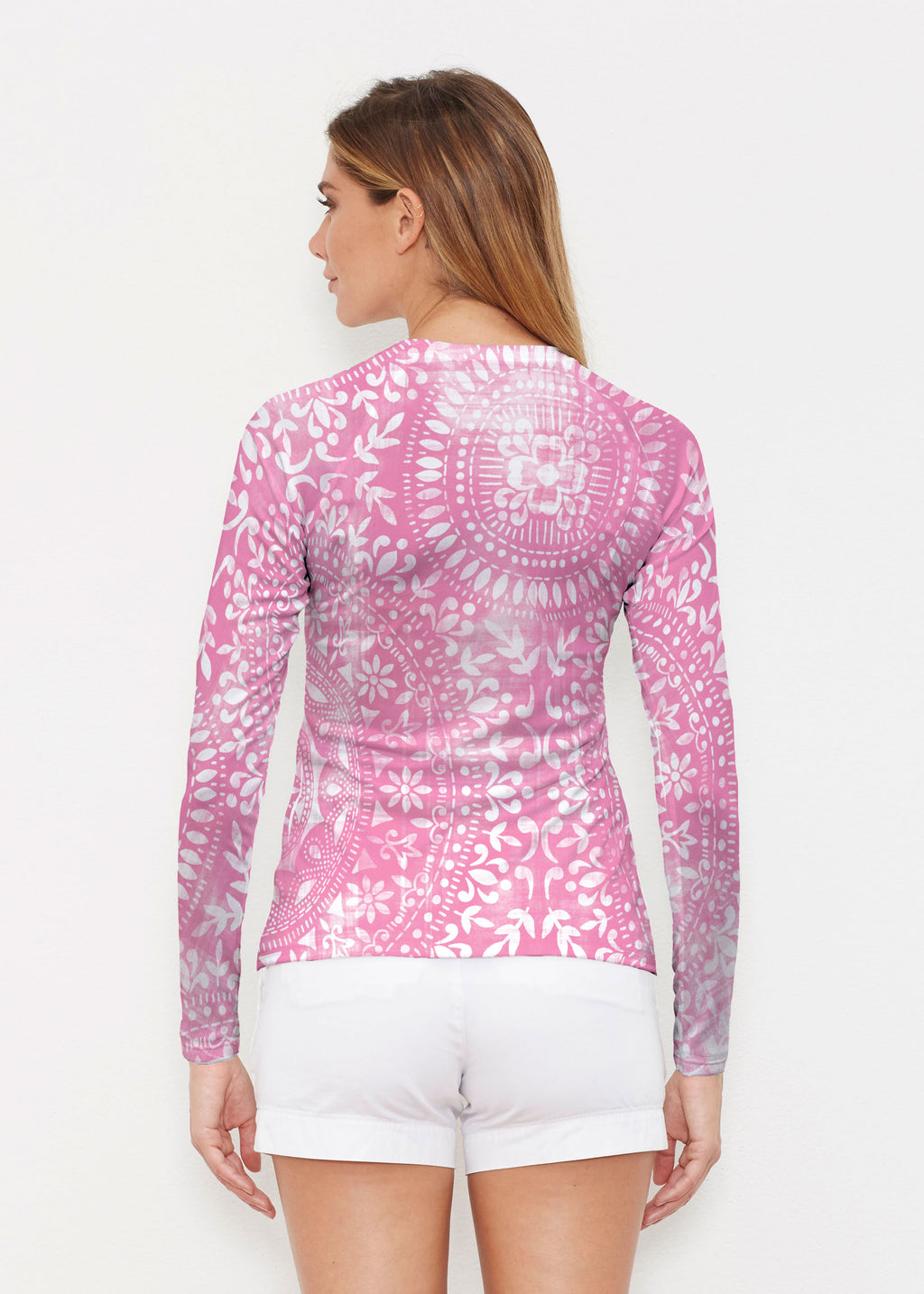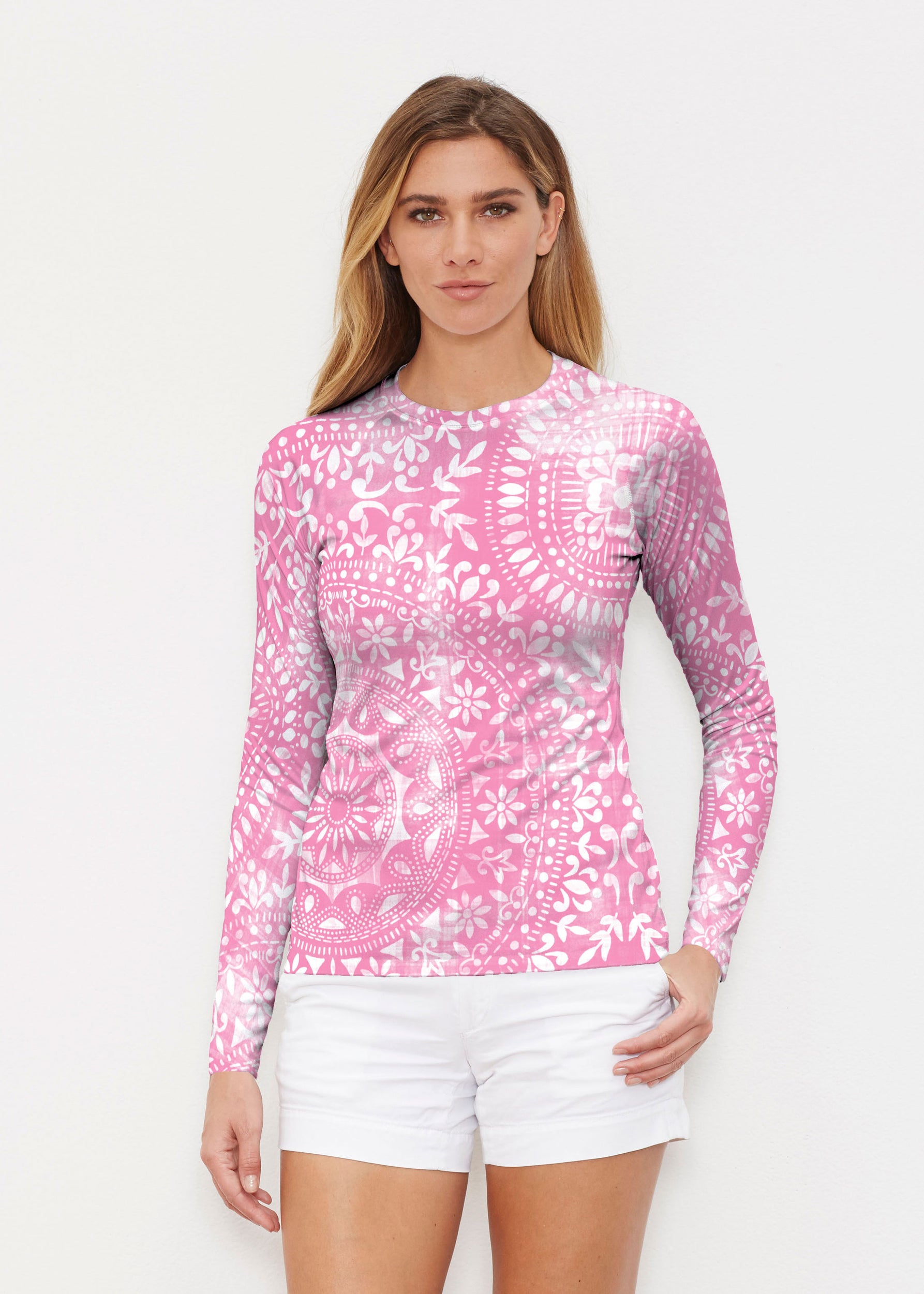 Our WHIMSY ROSE™ Safe Sun UPF 50+ long sleeve, crew neck rash guard offers versatile, beach-to-bistro style, supreme comfort, and an activewear fit. Made in a specially designed Safe Sun textile that blocks more harmful rays and provides a smart solution for those who love to swim, surf, kayak, canoe, waterski, boat, or simply relax waterside.