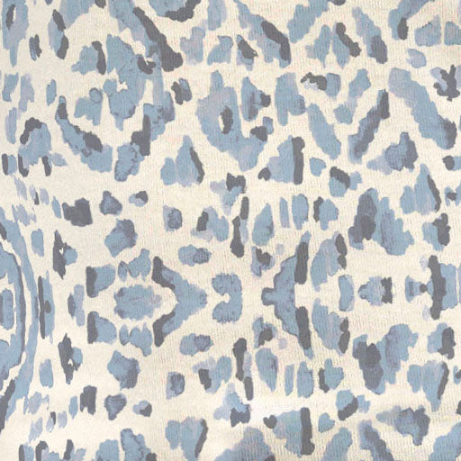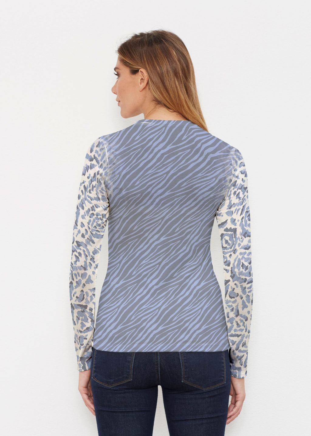 A mixed print with a Batik inspired Ikat pattern on the front and sleeves with an alluring abstract Zebra pattern on the back both of blue and navy. Designed by Susan Werner.
