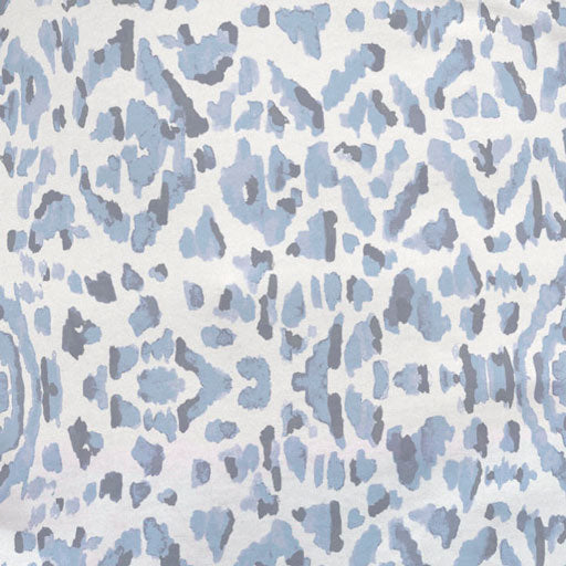 A mixed print with a Batik inspired Ikat pattern on the front and sleeves with an alluring abstract Zebra pattern on the back both of blue and navy. Designed by Susan Werner.