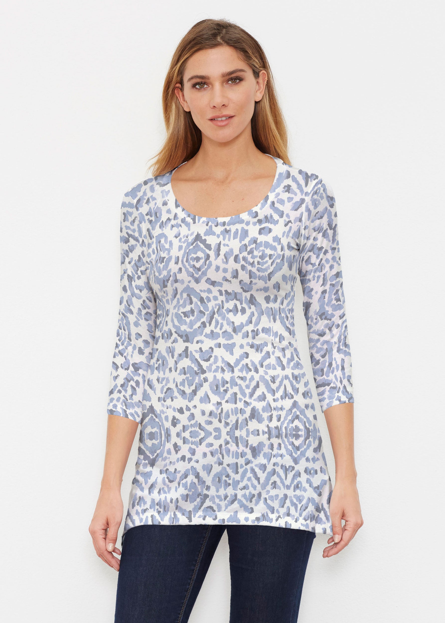 Surprising comfort and style combine in our luxurious Buttersoft blend. A delicate scoop neck, 3/4 sleeve, sweeping curved hemline falls just below the hip.
