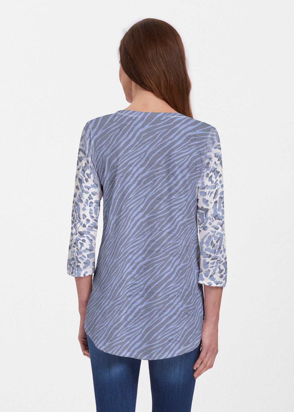 A mixed print with a Batik inspired Ikat pattern on the front and sleeves with an alluring abstract Zebra pattern on the back both of blue and navy. Designed by Susan Werner.