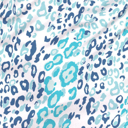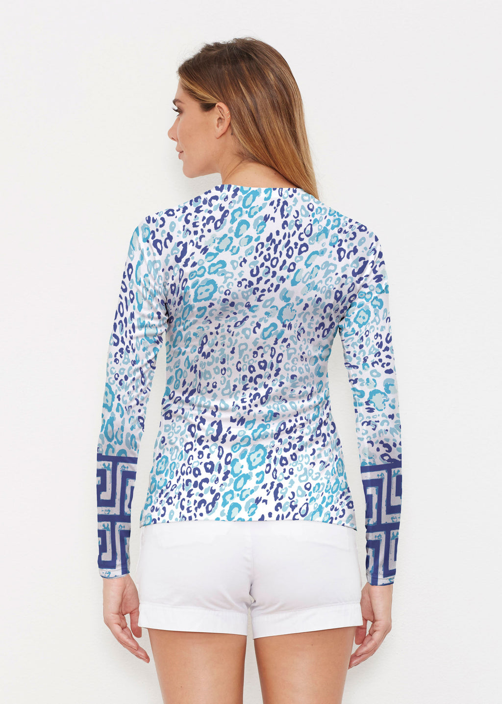 A fun yet sophisticated mixed print with bands of abstract leopard spots in turquoise & mint and navy & aqua with a classic Greek Key pattern on the sleeve ends. Designed by Susan Werner.