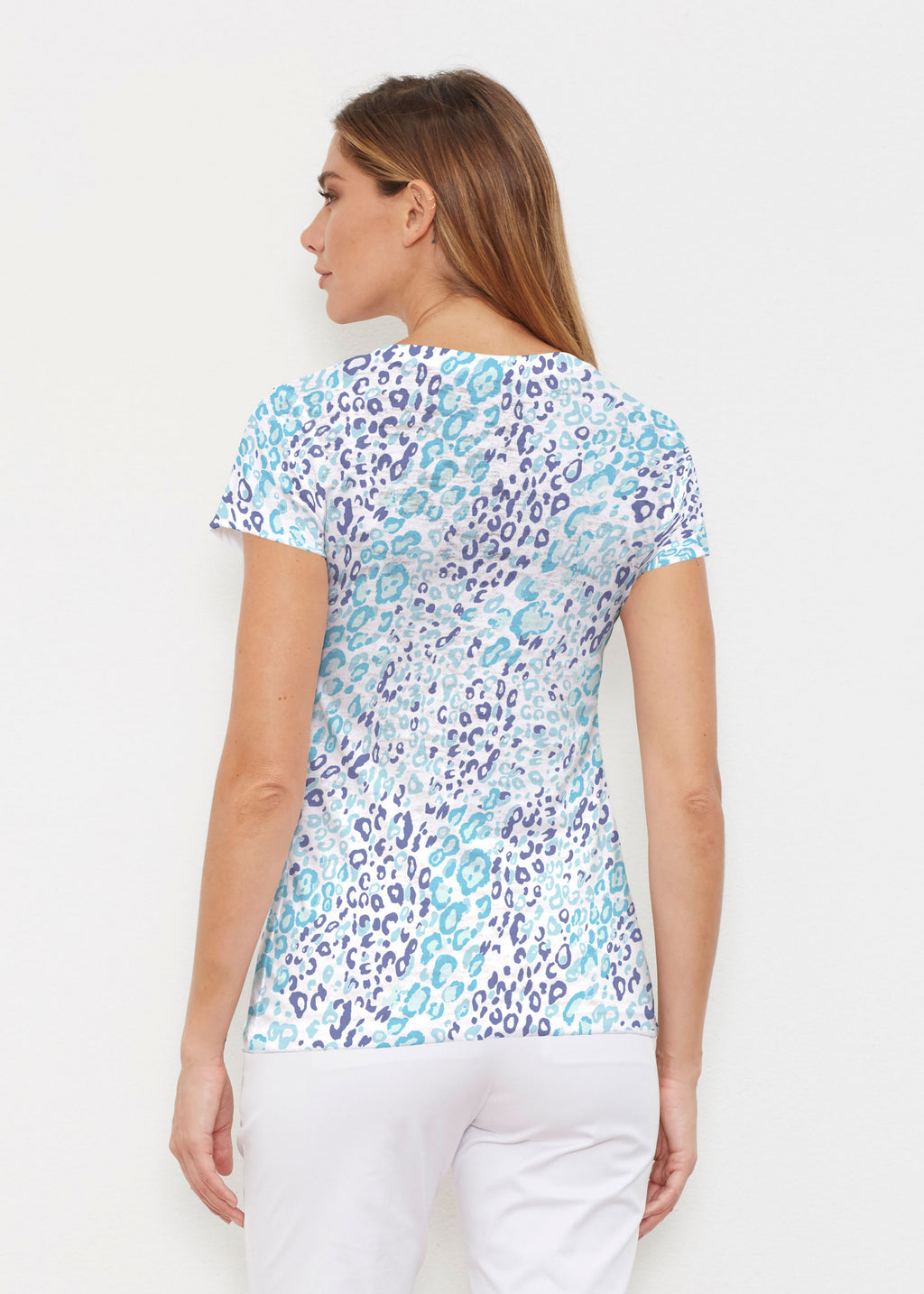 A fun yet sophisticated mixed print with bands of abstract leopard spots in turquoise & mint and navy & aqua with a classic Greek Key pattern on the sleeve ends. Designed by Susan Werner.
