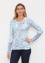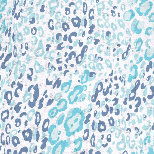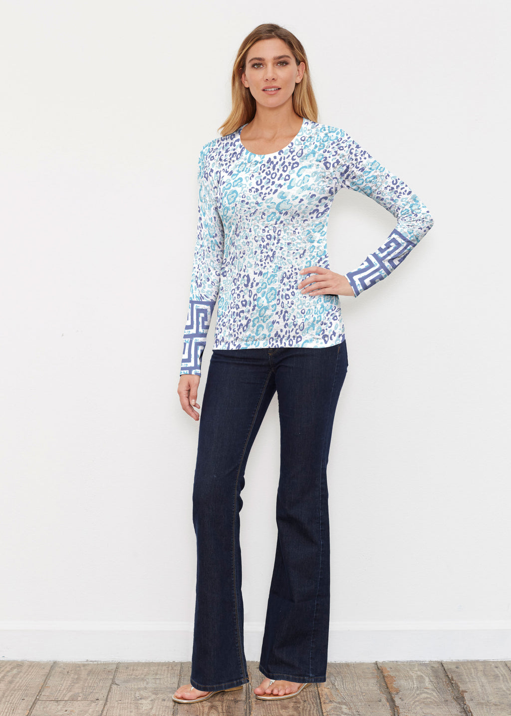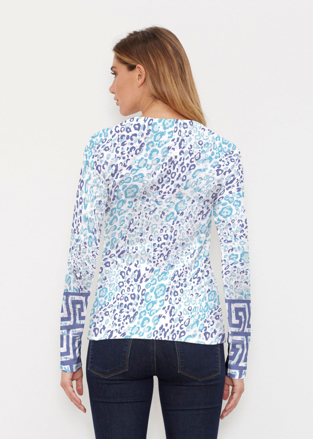A fun yet sophisticated mixed print with bands of abstract leopard spots in turquoise & mint and navy & aqua with a classic Greek Key pattern on the sleeve ends. Designed by Susan Werner.