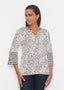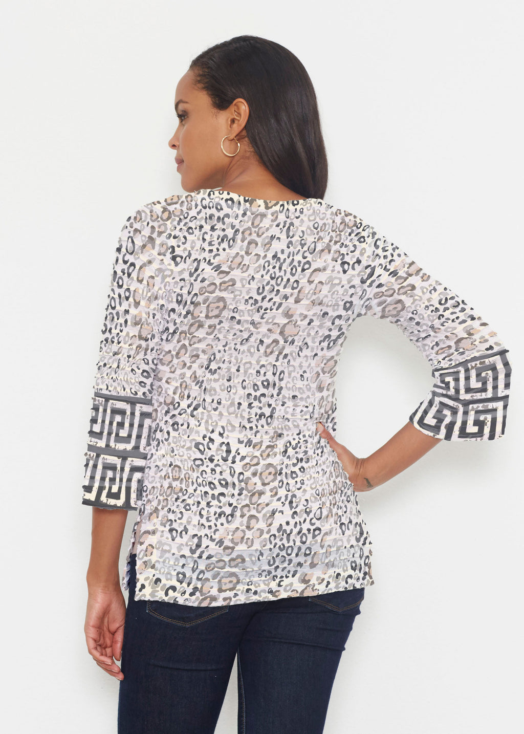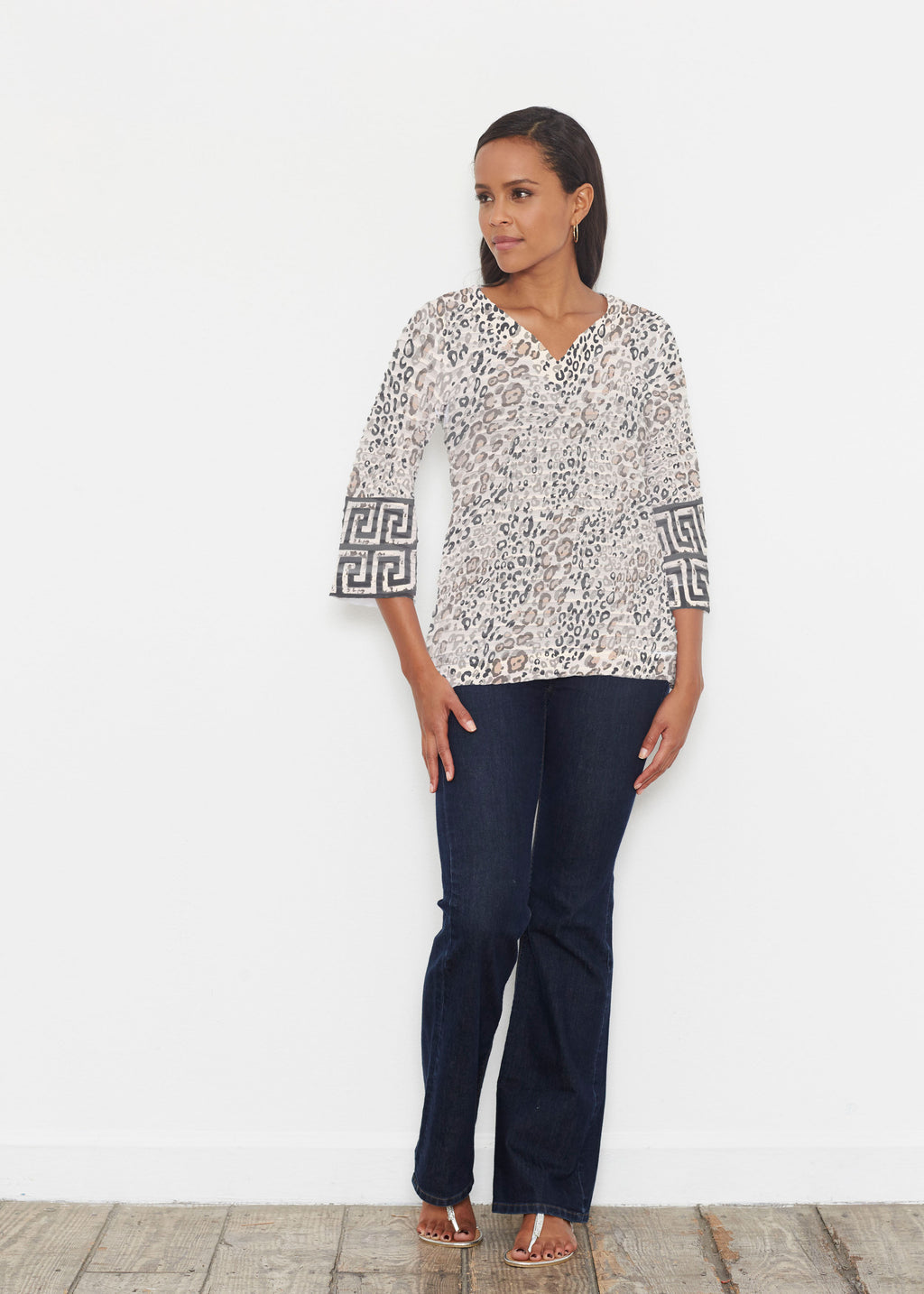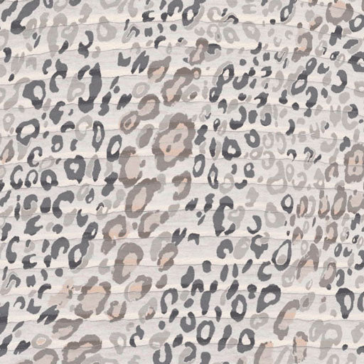 A fun yet sophisticated mixed print with bands of abstract leopard spots in grey & black and brown & beige with a classic Greek Key pattern on the sleeve ends. Designed by Susan Werner.