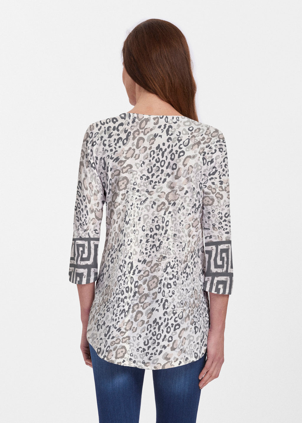 A fun yet sophisticated mixed print with bands of abstract leopard spots in grey & black and brown & beige with a classic Greek Key pattern on the sleeve ends. Designed by Susan Werner.