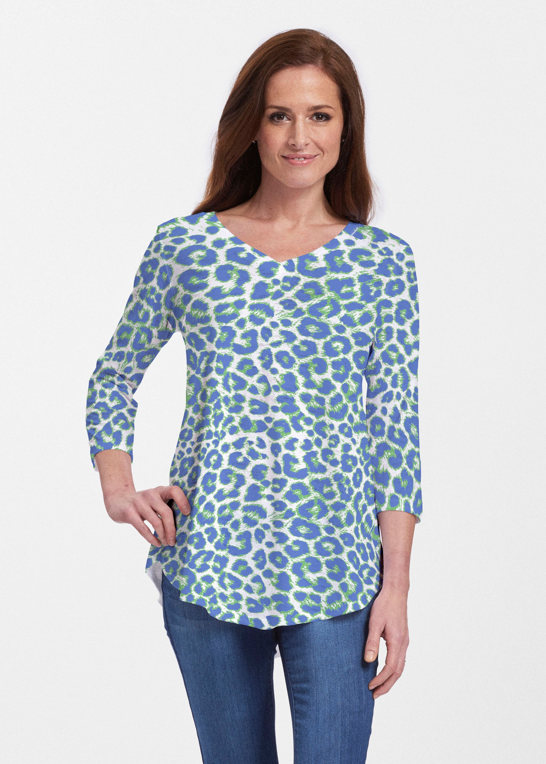 This v-neck tunic in our Signature burnout fabric is forever flattering. 3/4 sleeves and a v-neck flow into a full, swinging shirttail hem.