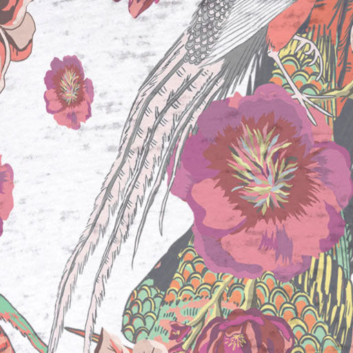 Whimsical bird print with beautiful florals in burgundy, orange and pink.