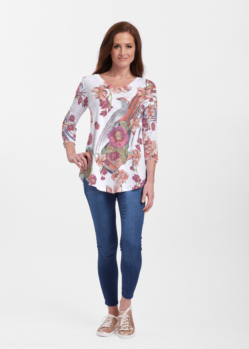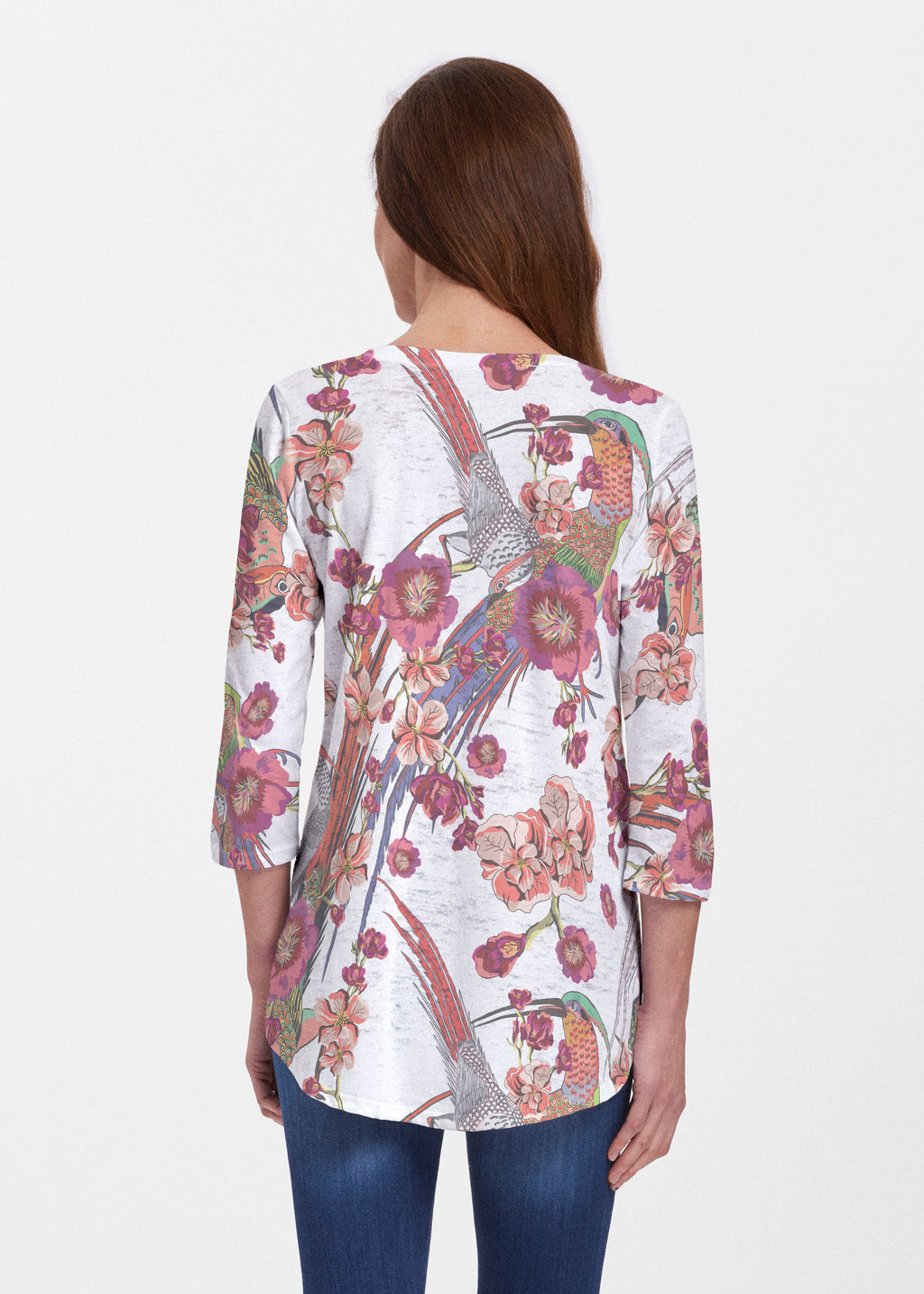 This v-neck tunic in our Signature burnout fabric is forever flattering. 3/4 sleeves and a v-neck flow into a full, swinging shirttail hem.