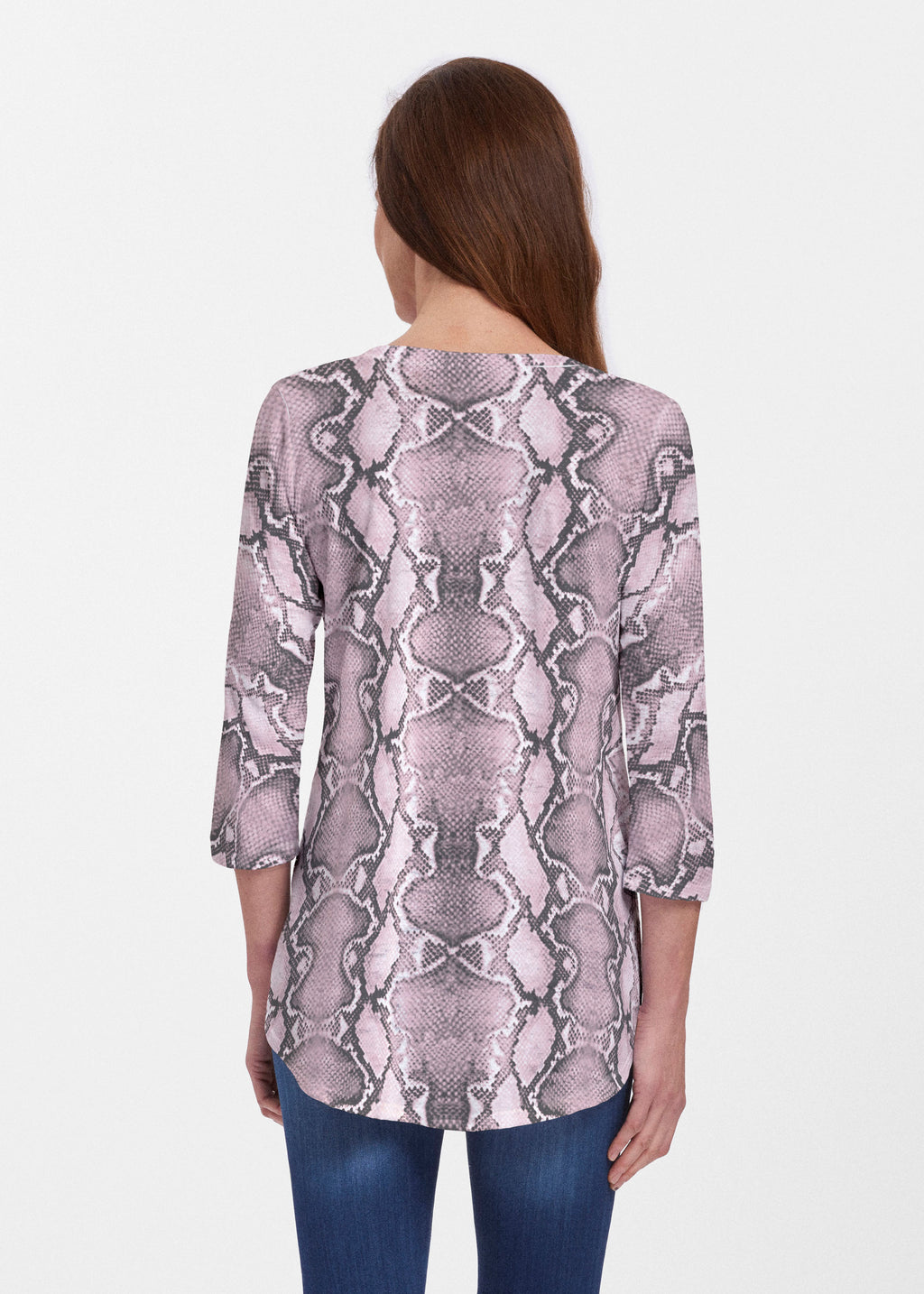 This v-neck tunic in our Signature burnout fabric is forever flattering. 3/4 sleeves and a v-neck flow into a full, swinging shirttail hem.