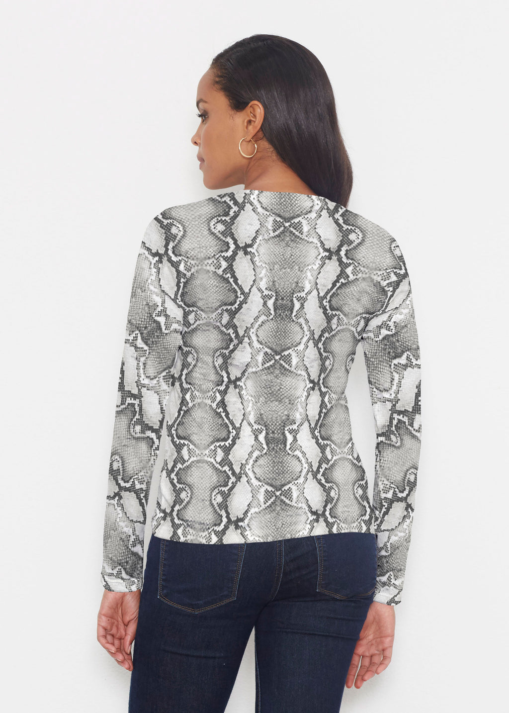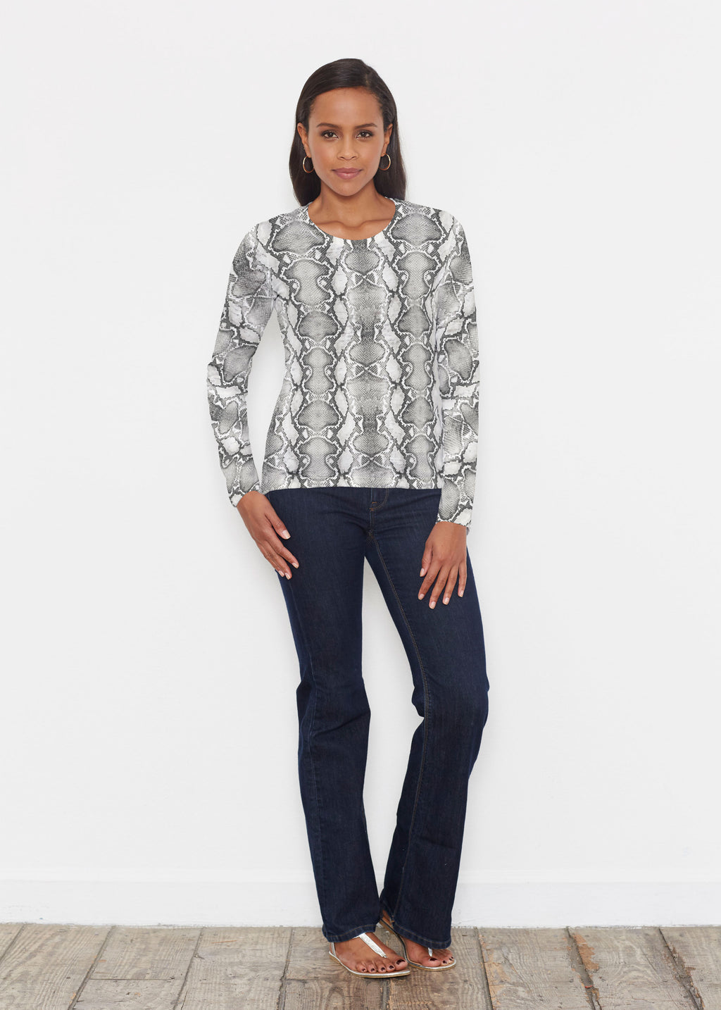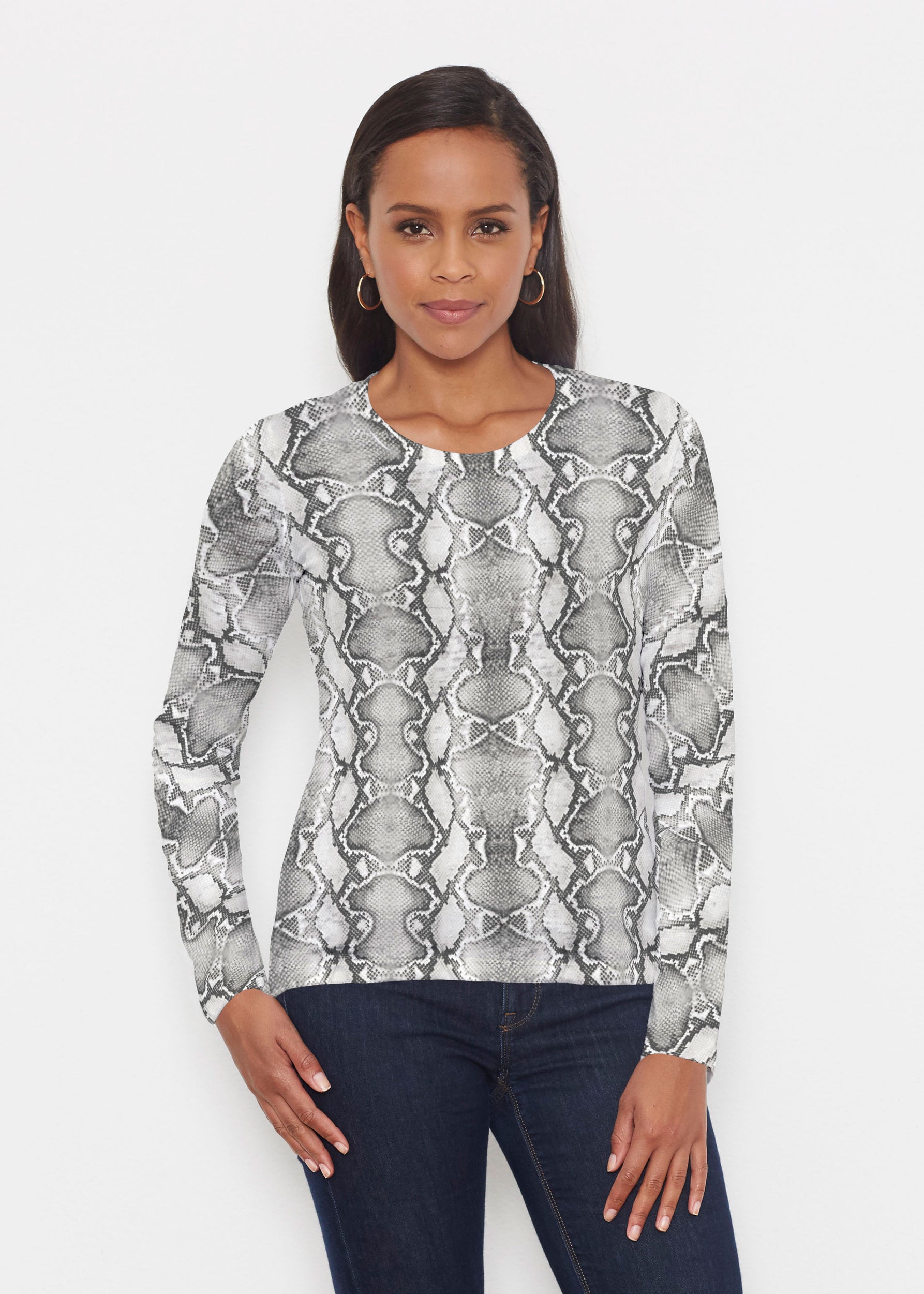 So on trend right now, let this silver python print slither into your wardrobe this season. Designed by Susan Werner.