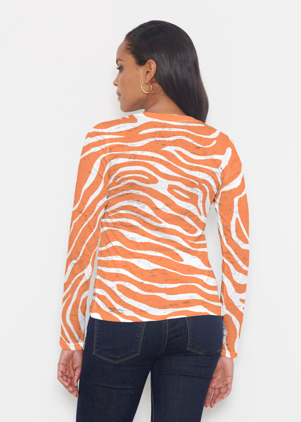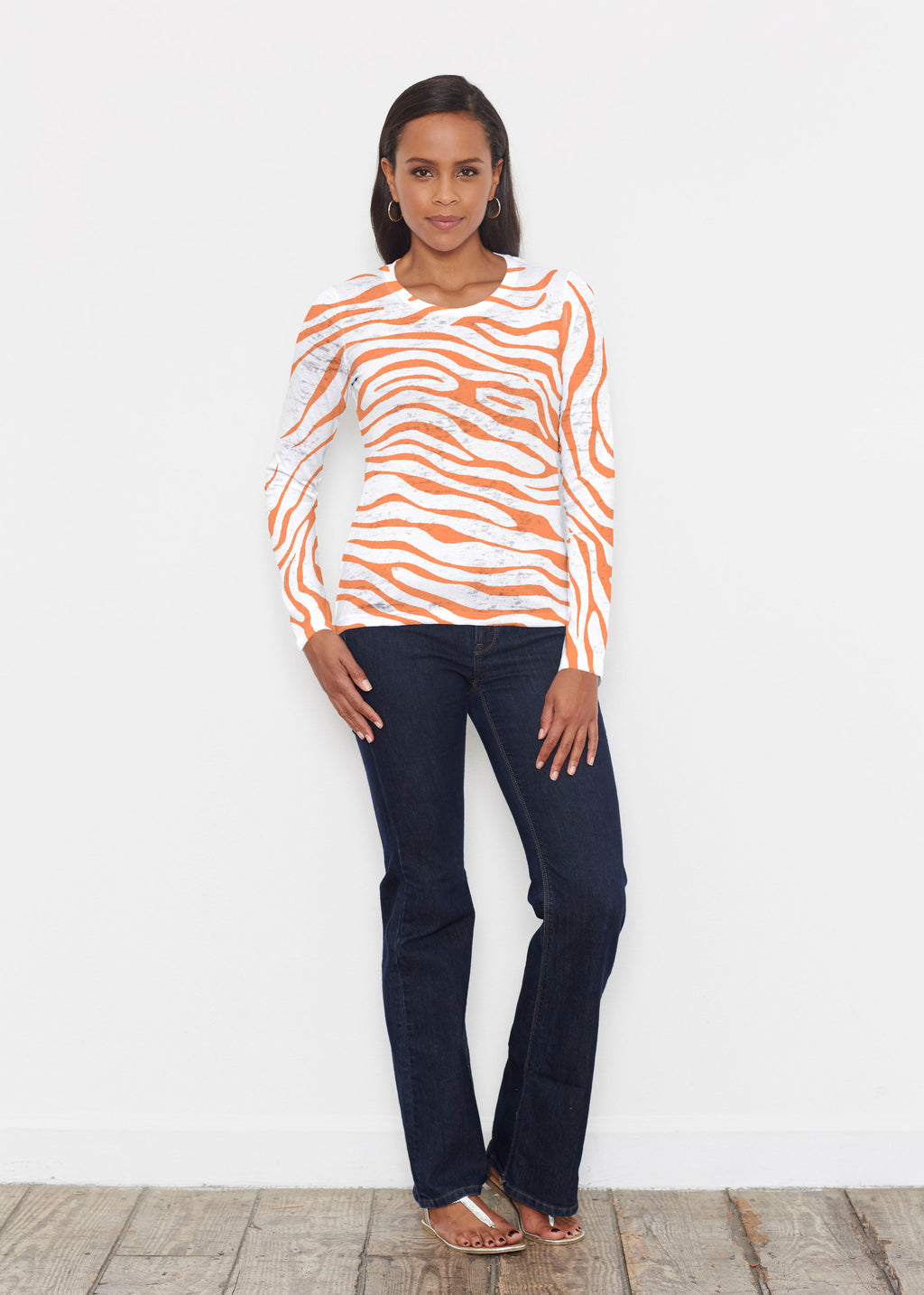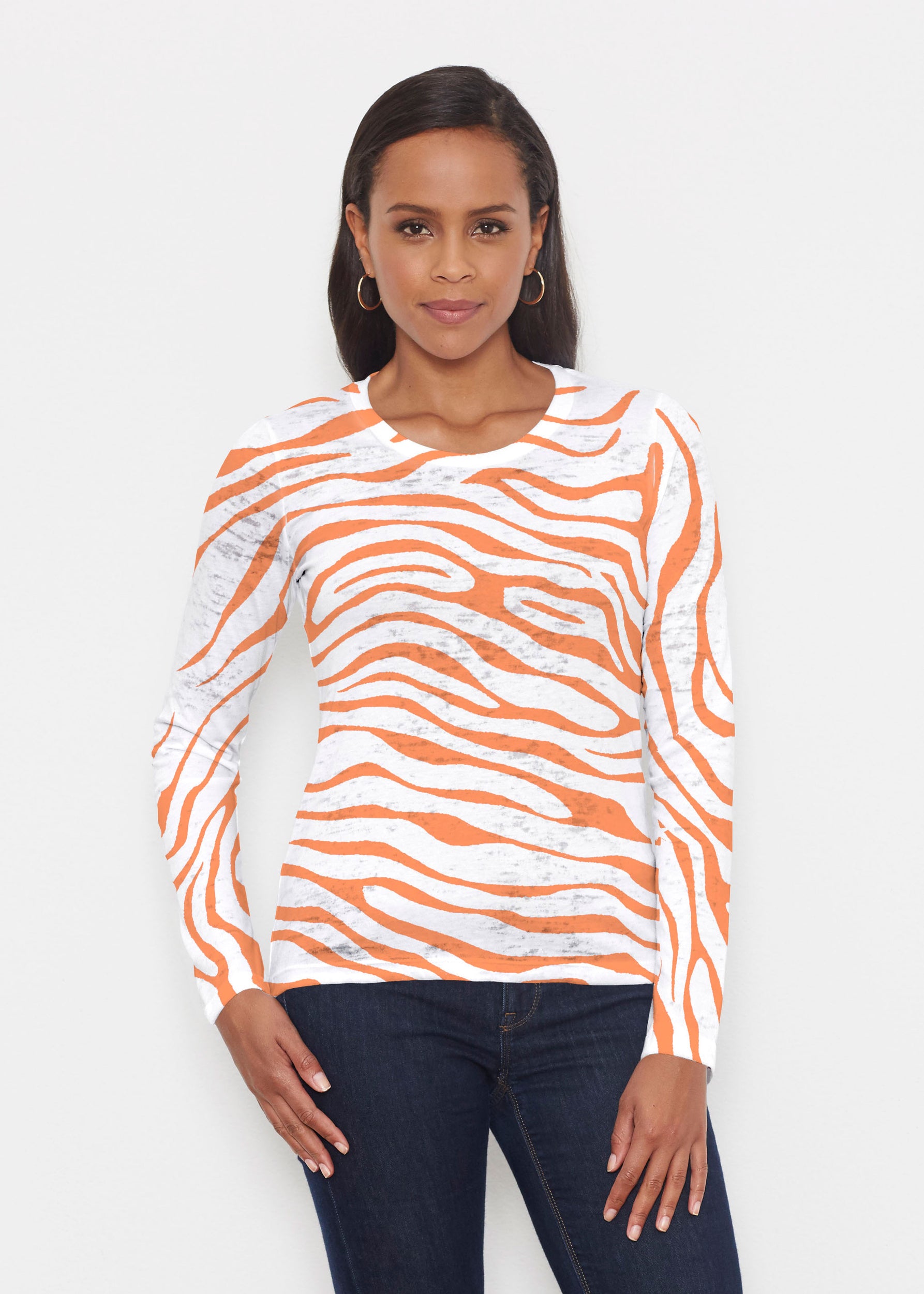 Be on trend with this wild and bold zebra print in orange and white by Susan Werner.