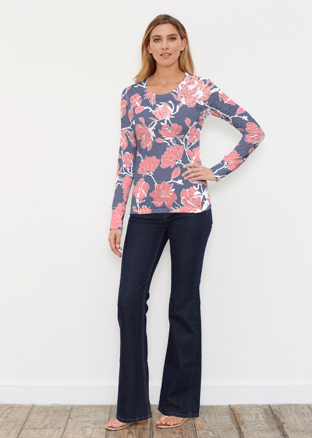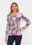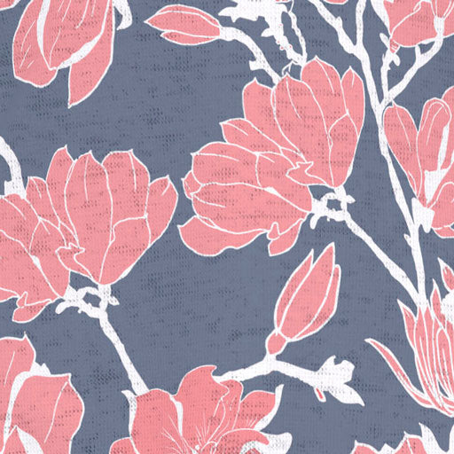 A beautiful mixed navy print of red blooming magnolias on the front and sleeves with a captivating beaded pattern on the back. Designed by Susan Werner.