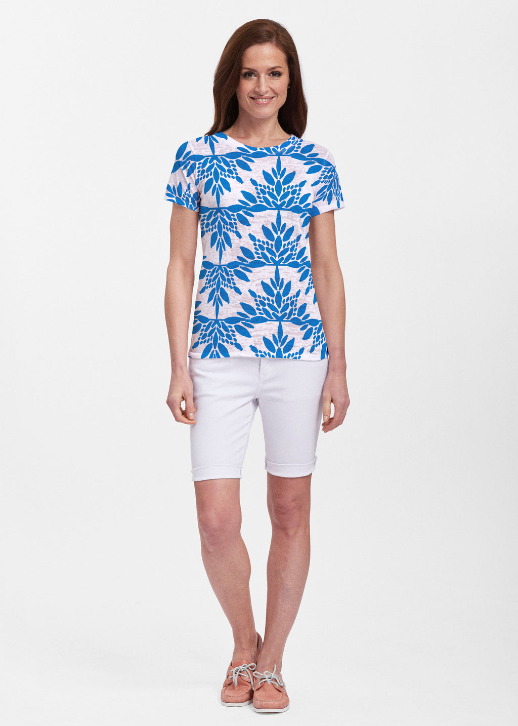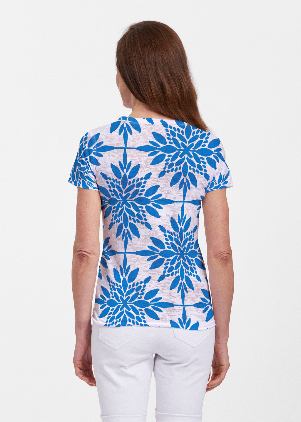 B+A's Sheer burnout fabric provides a fun contemporary look with a more visible burnout texture, that is truly soft to the touch. A nicely fit shirt that falls at the hip, available in both crew and v-neck short sleeves.