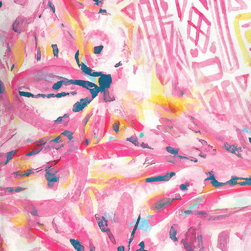 A "lilly" feel of soft pinks and yellows with scattered splashes of navy and aqua.