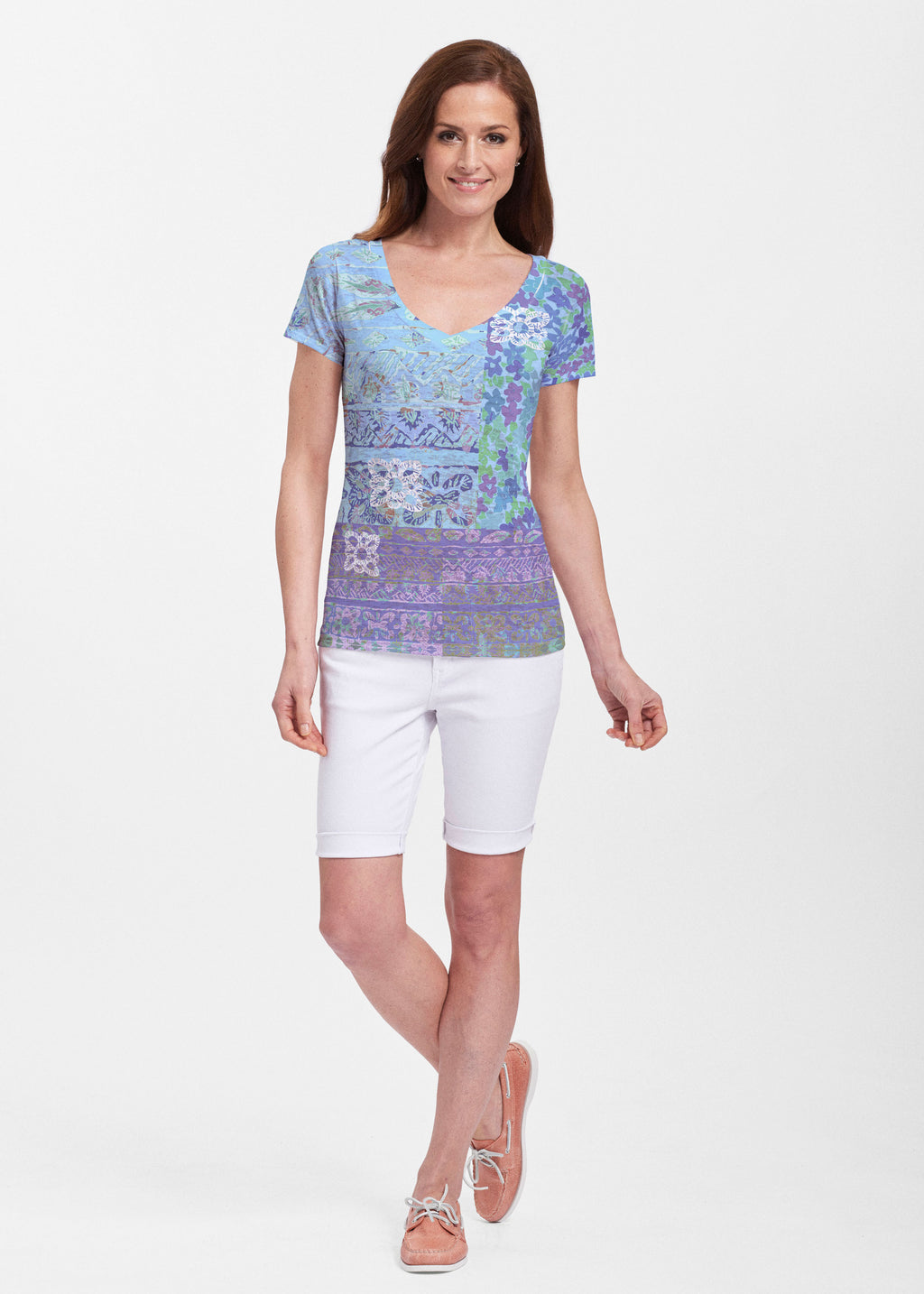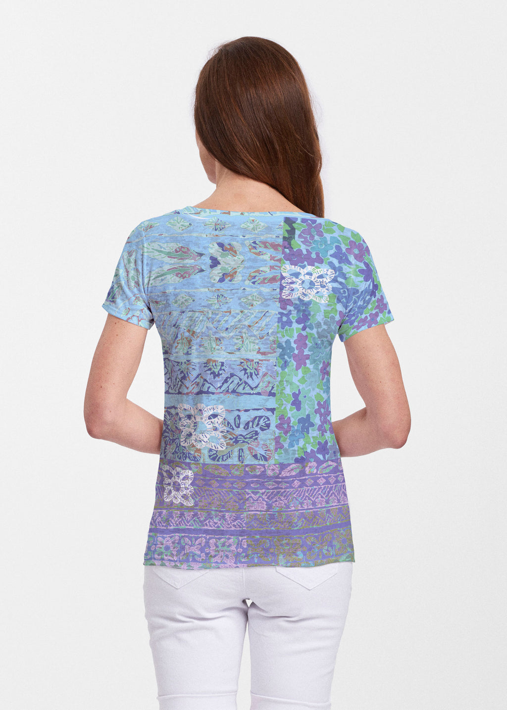 B+A's Sheer burnout fabric provides a fun contemporary look with a more visible burnout texture, that is truly soft to the touch. A nicely fit shirt that falls at the hip, available in both crew and v-neck short sleeves.