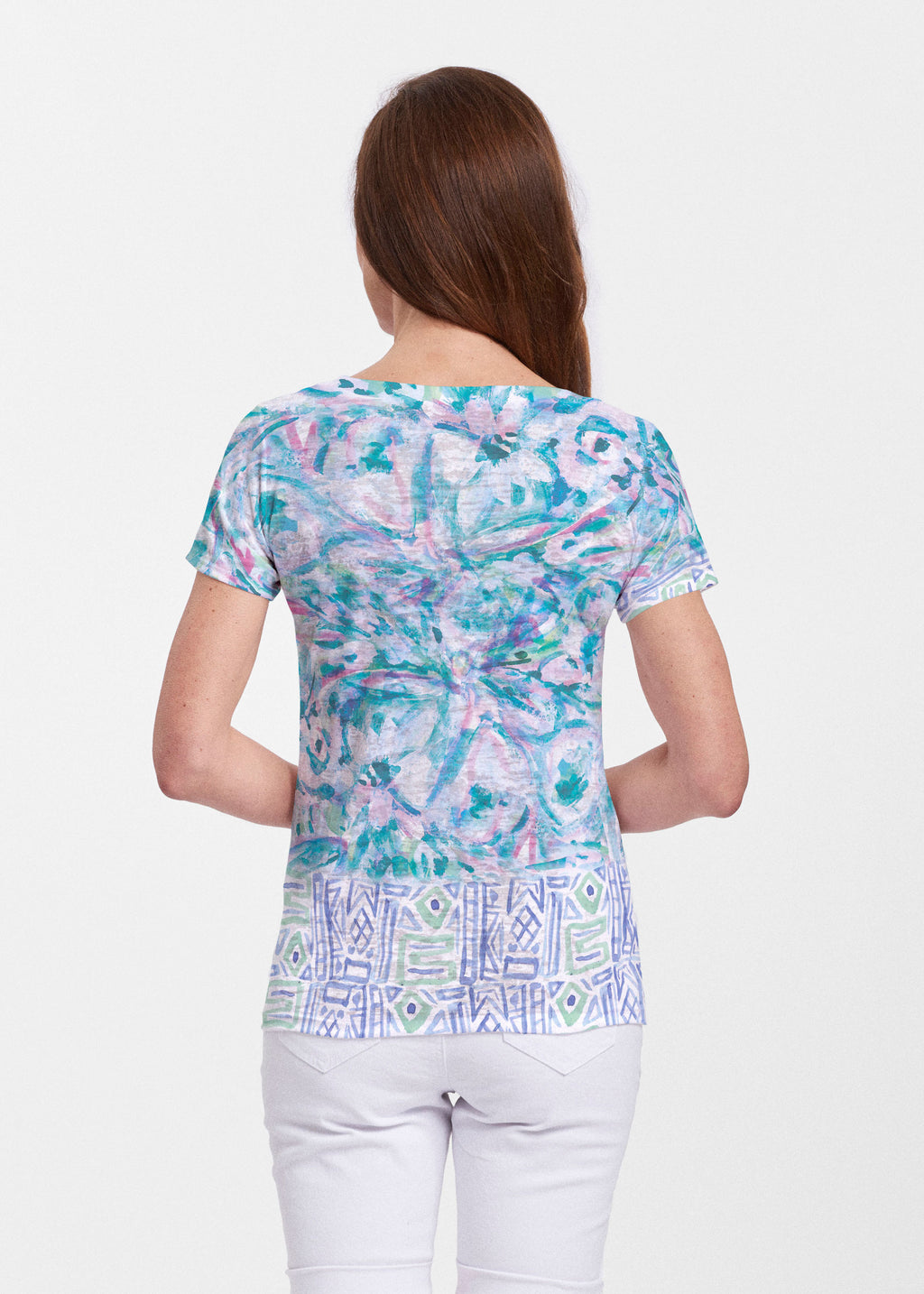 A "Lilly" feel of soft greens and blues with scattered splashes of hot pink and teal.