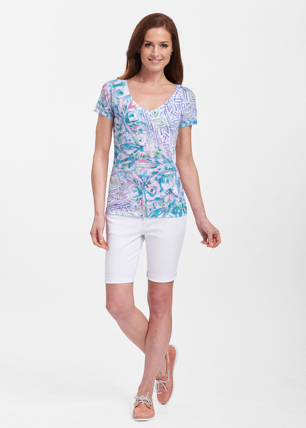 B+A's Sheer burnout fabric provides a fun contemporary look with a more visible burnout texture, that is truly soft to the touch. A nicely fit shirt that falls at the hip, available in both crew and v-neck short sleeves.