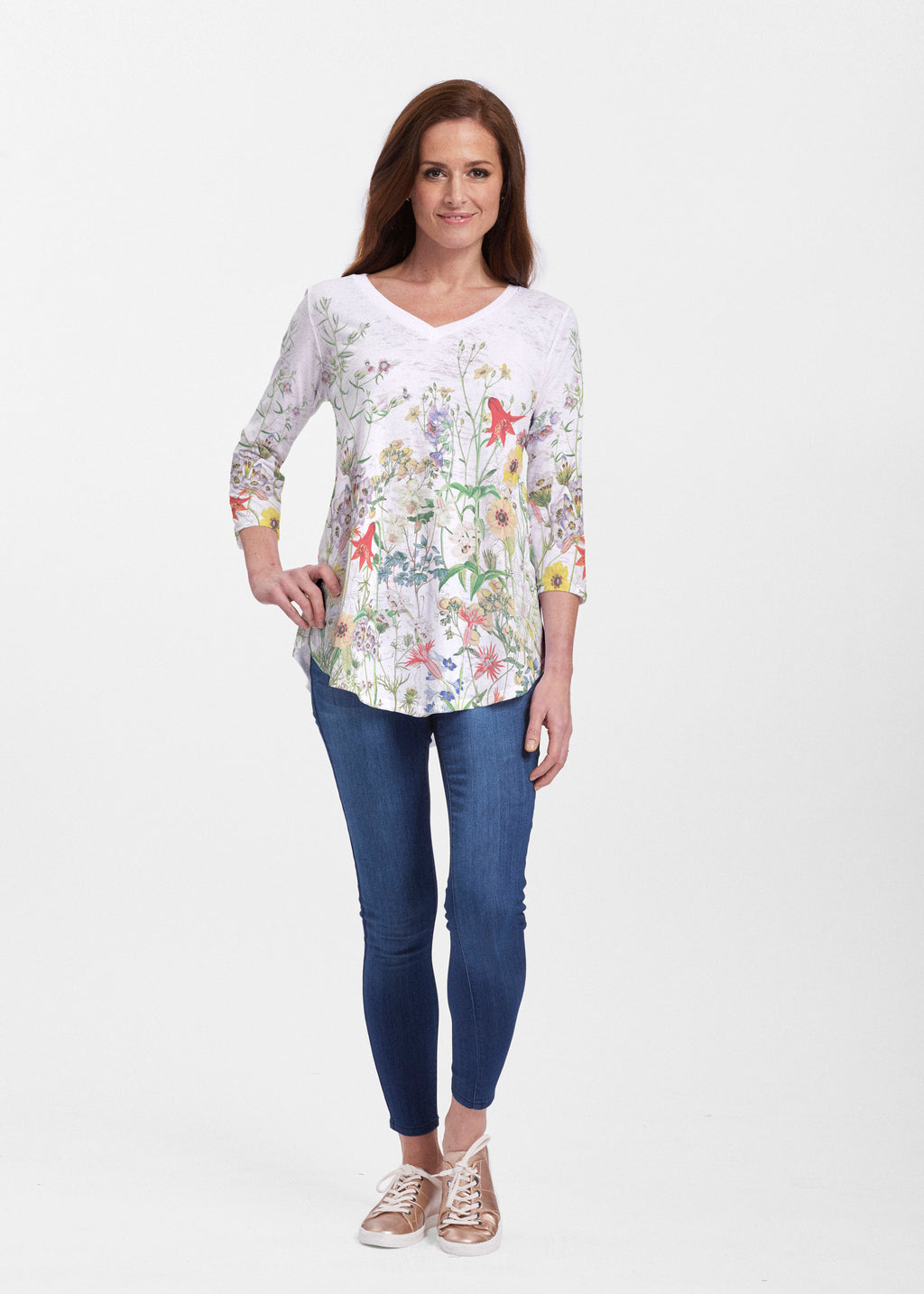 This v-neck tunic in our Signature burnout fabric is forever flattering. 3/4 sleeves and a v-neck flow into a full, swinging shirttail hem.