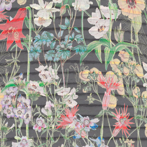 This painterly floral print incorporates a splendid array of multi-colored prairie flowers, glowingly offset against a midnight black canvas - Designed by Susan Werner