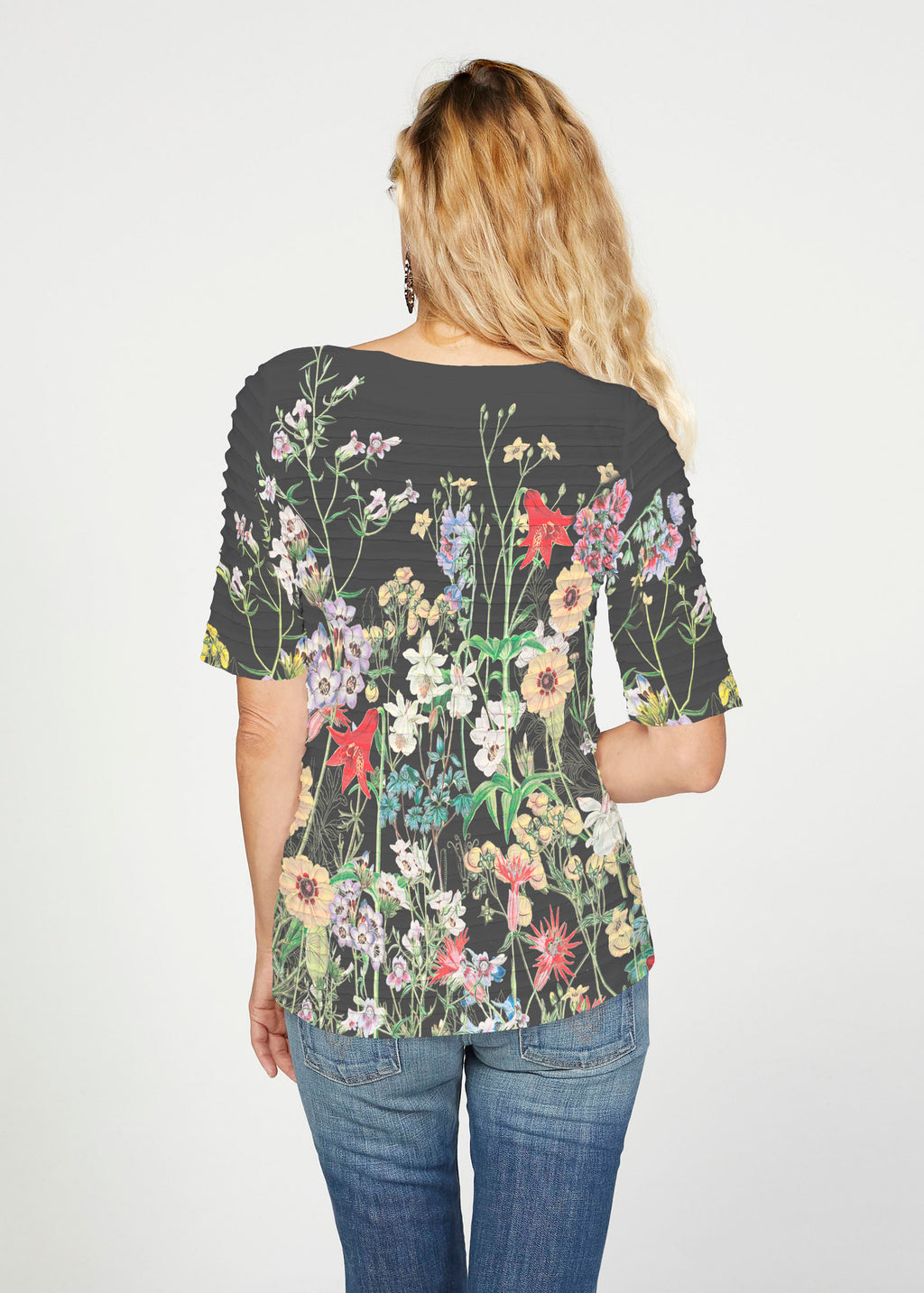 The uniquely soft, pleated texture in this Banded fabric gives the elbow sleeve and boat neck top a fun and sophisticated look. Easy relaxed fit with a hemline that comes below the hip.