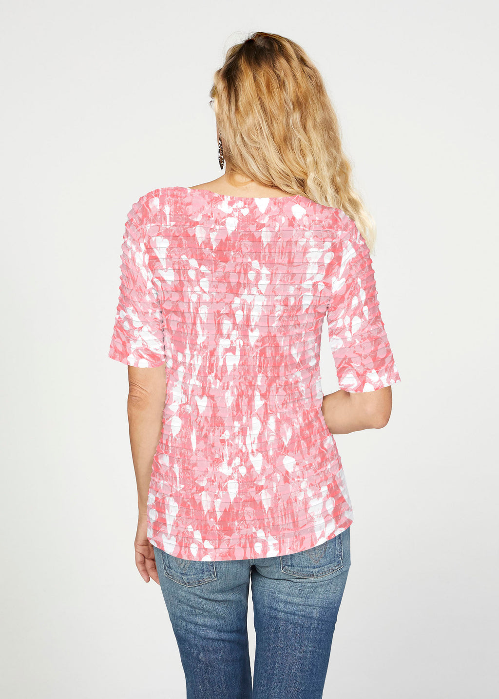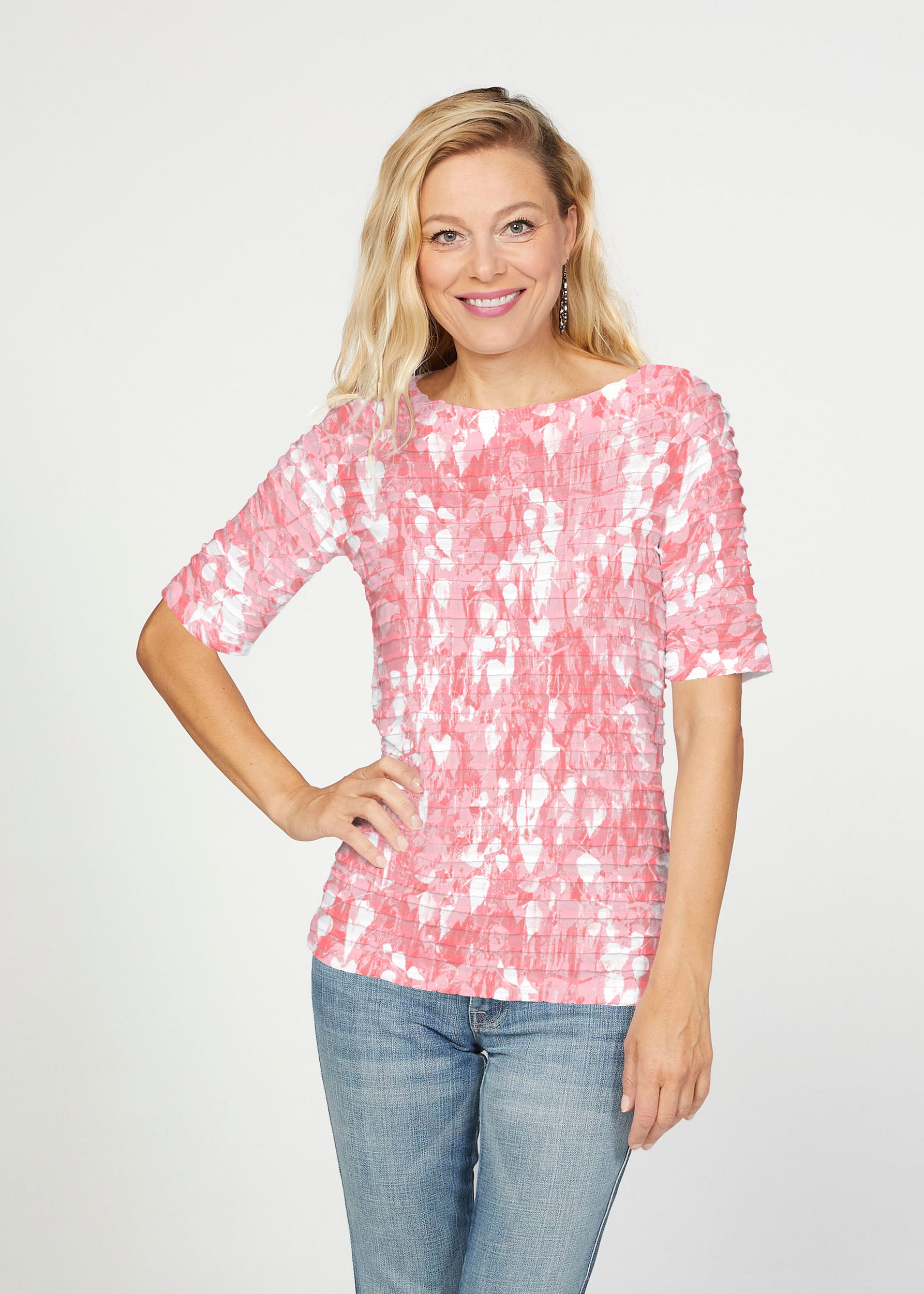 The uniquely soft, pleated texture in this Banded fabric gives the elbow sleeve and boat neck top a fun and sophisticated look. Easy relaxed fit with a hemline that comes below the hip.