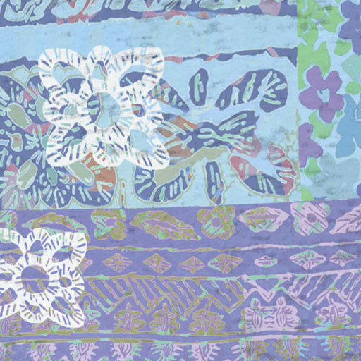 A playful collage of floral geometrics in aqua, purple and lime with patches of white.