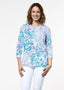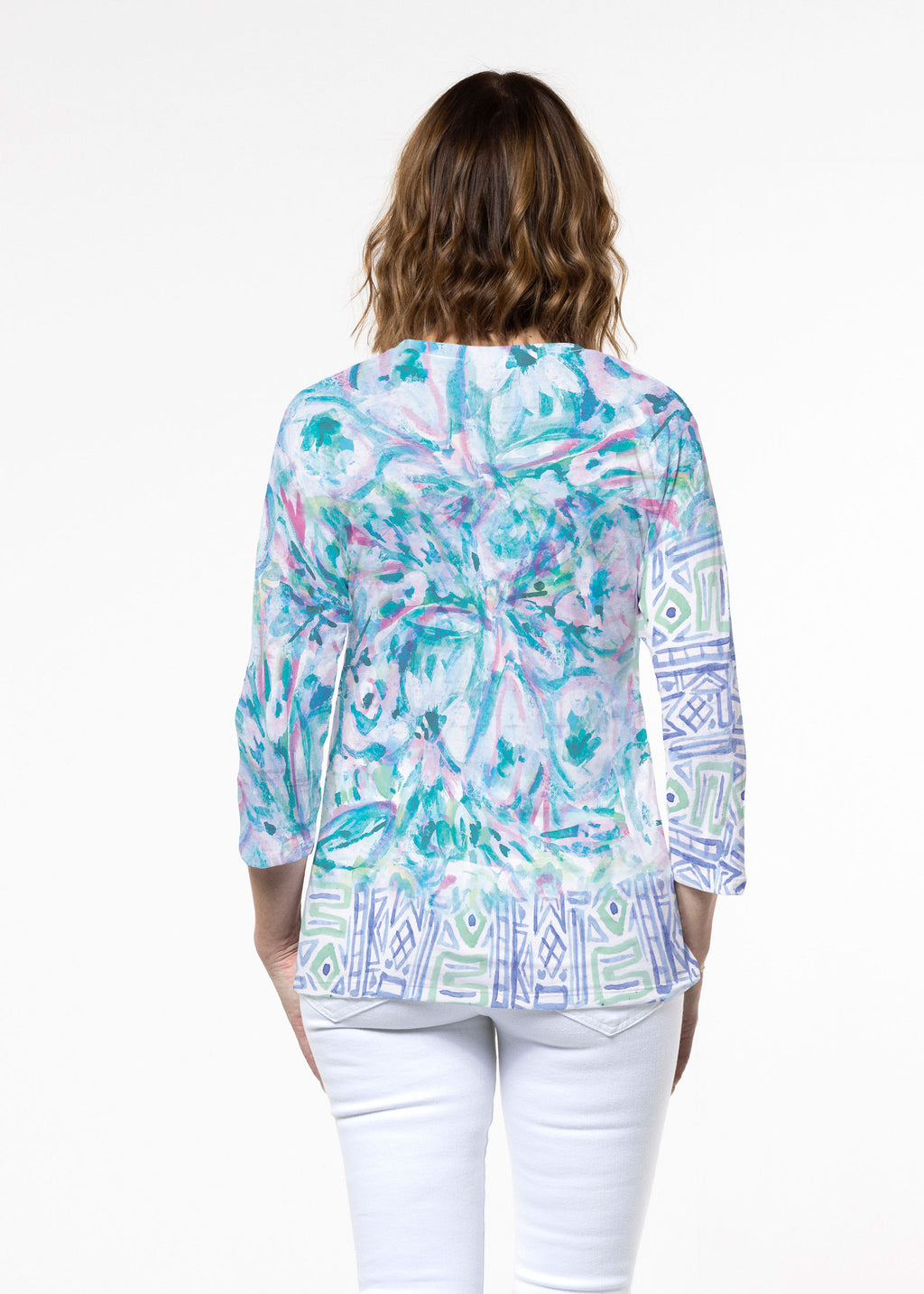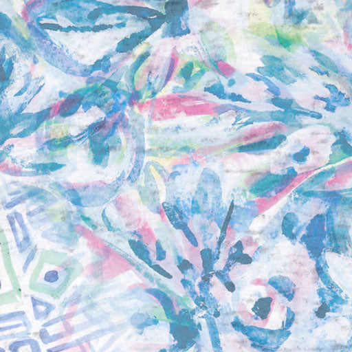A "Lilly" feel of soft greens and blues with scattered splashes of hot pink and teal.