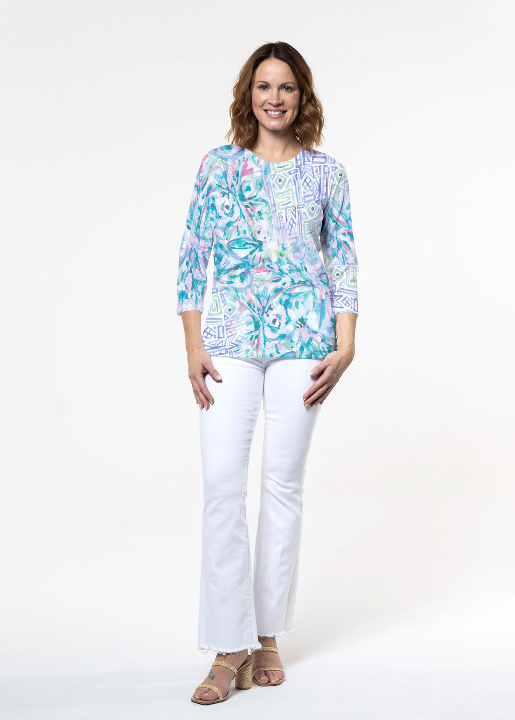 Flattering Signature fabric 3/4 sleeves and a crew neck are perfectly proportioned and more of a relaxed fit.