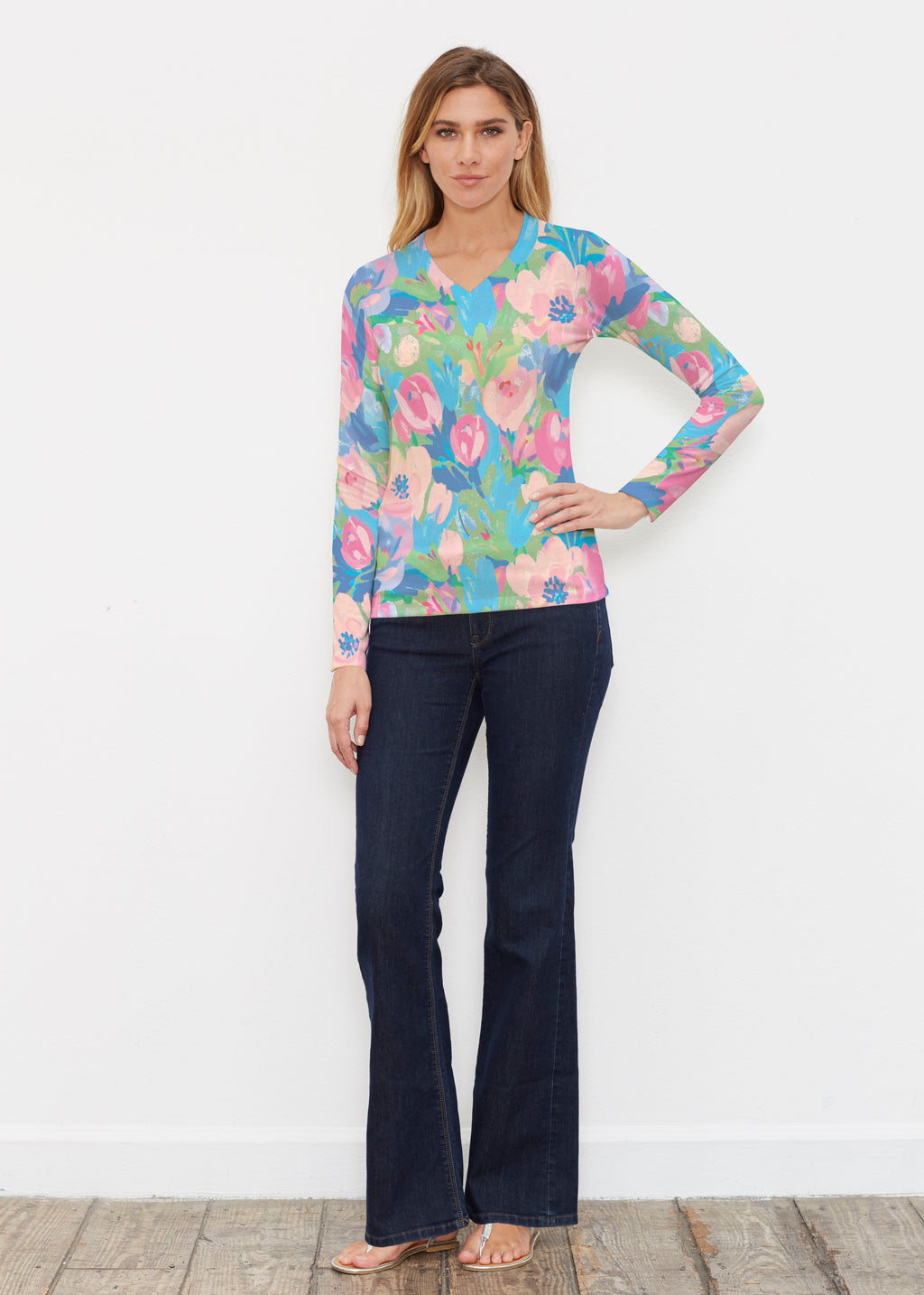 Jungle Warrior Blue (7850) ~ Butterknit Long Sleeve V-Neck Top