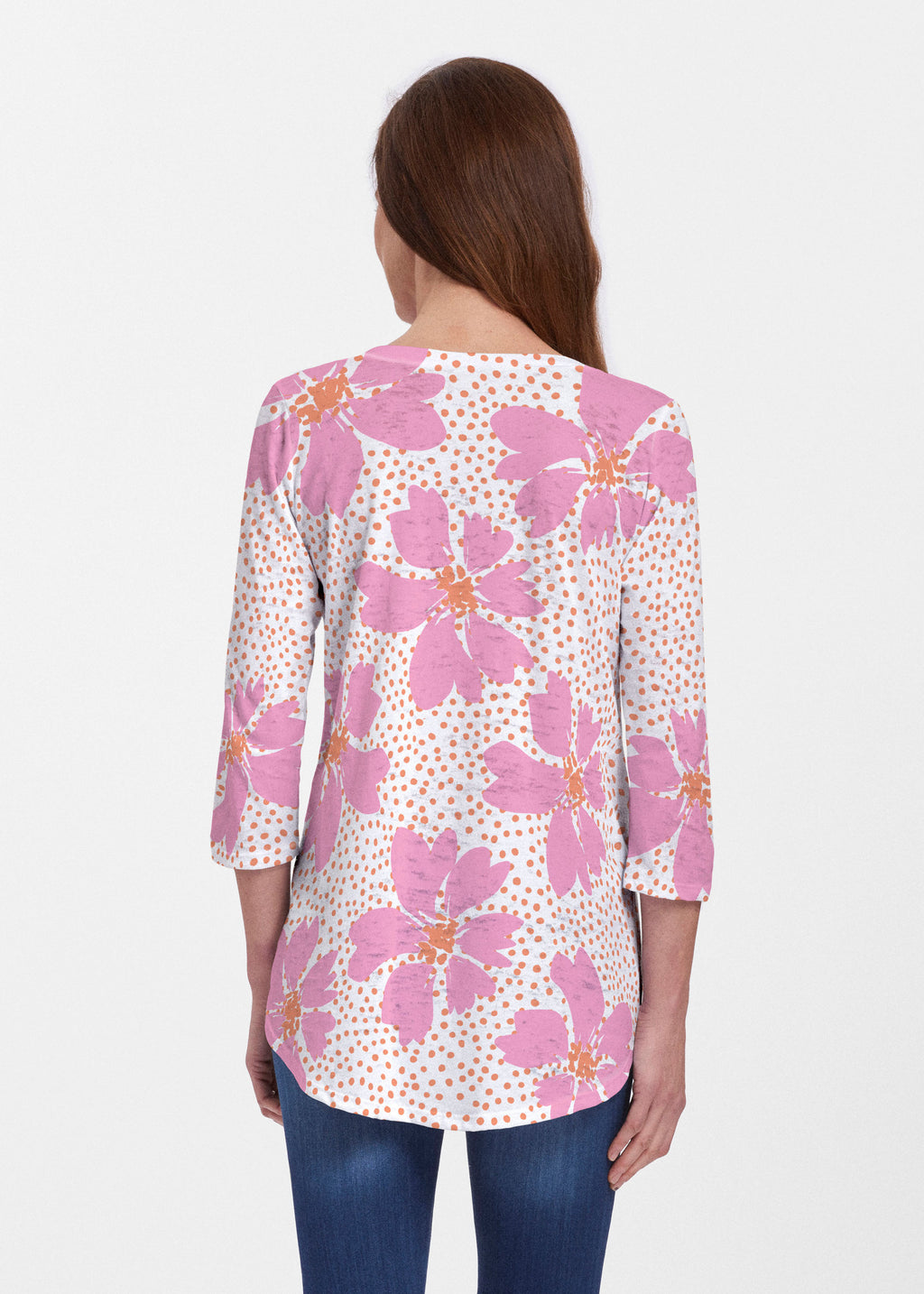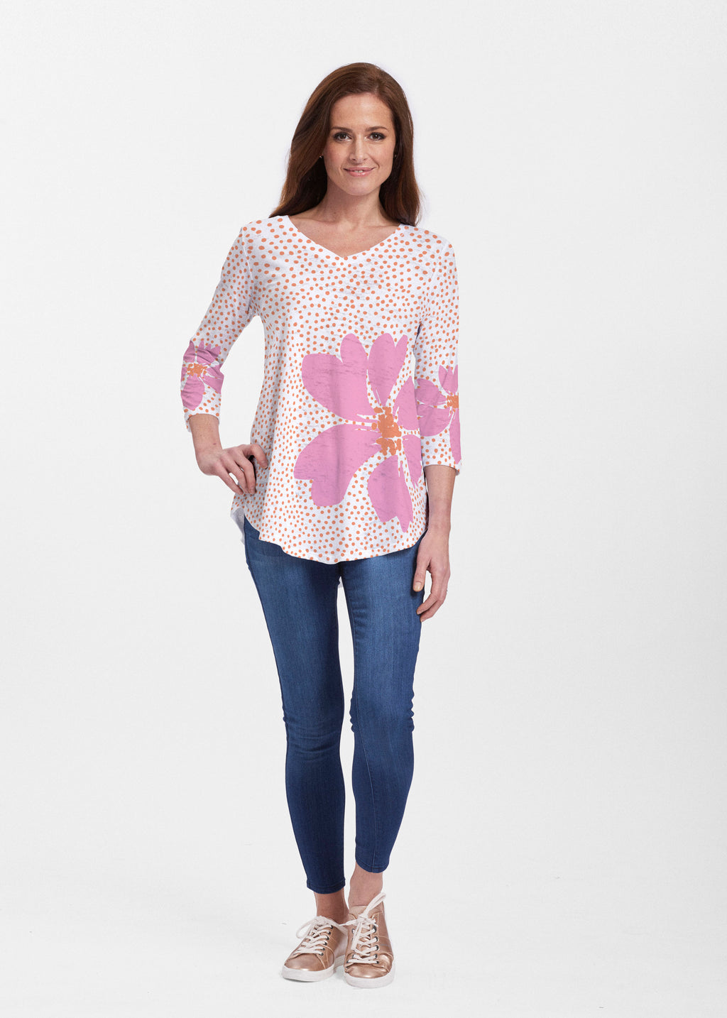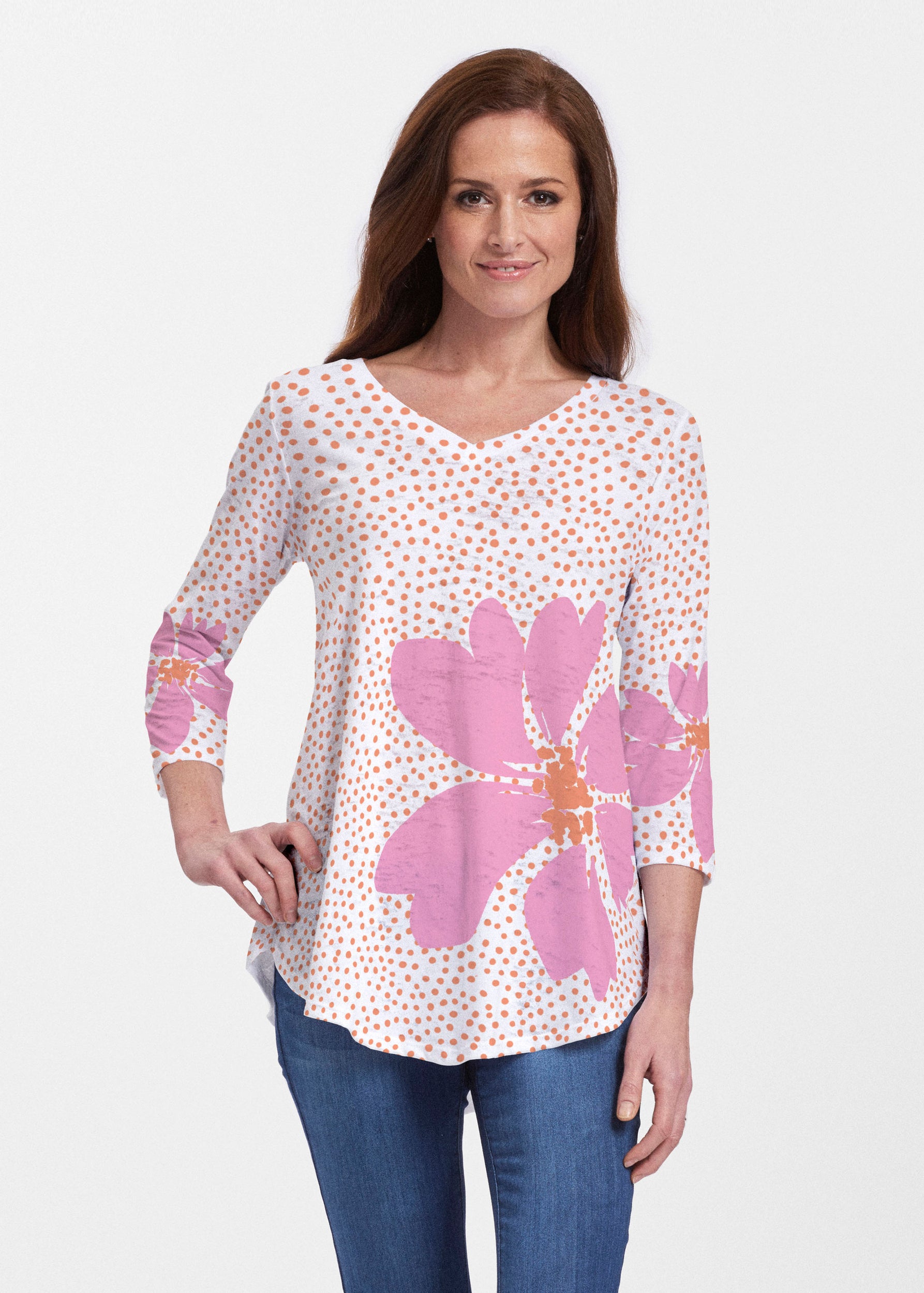 This v-neck tunic in our Signature burnout fabric is forever flattering. 3/4 sleeves and a v-neck flow into a full, swinging shirttail hem.