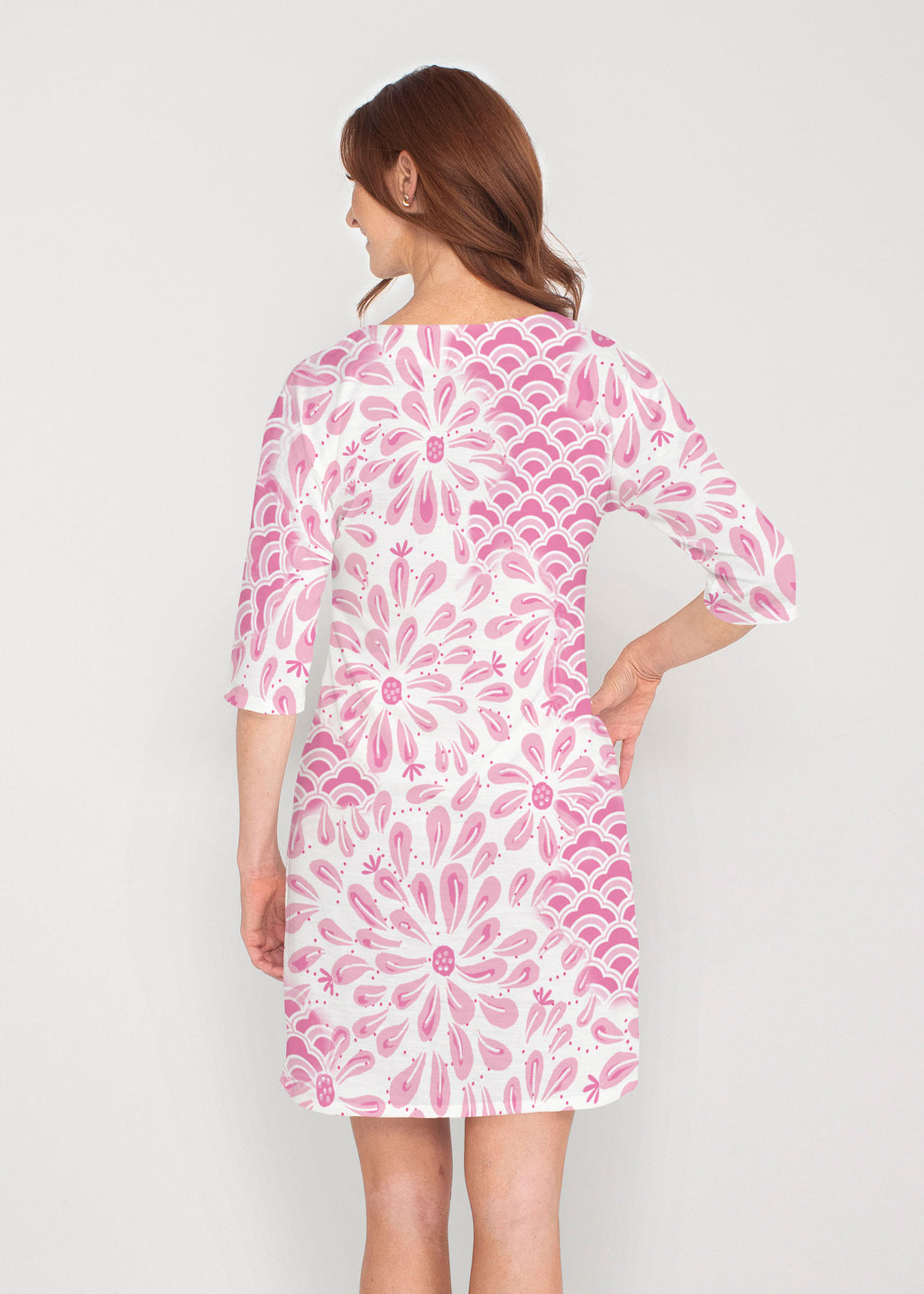 Be comfortable and fashionable all day in our soft Lucy fabric. This v-neck dress features loose 3/4 sleeves, drop shoulders and falls just at the knee.