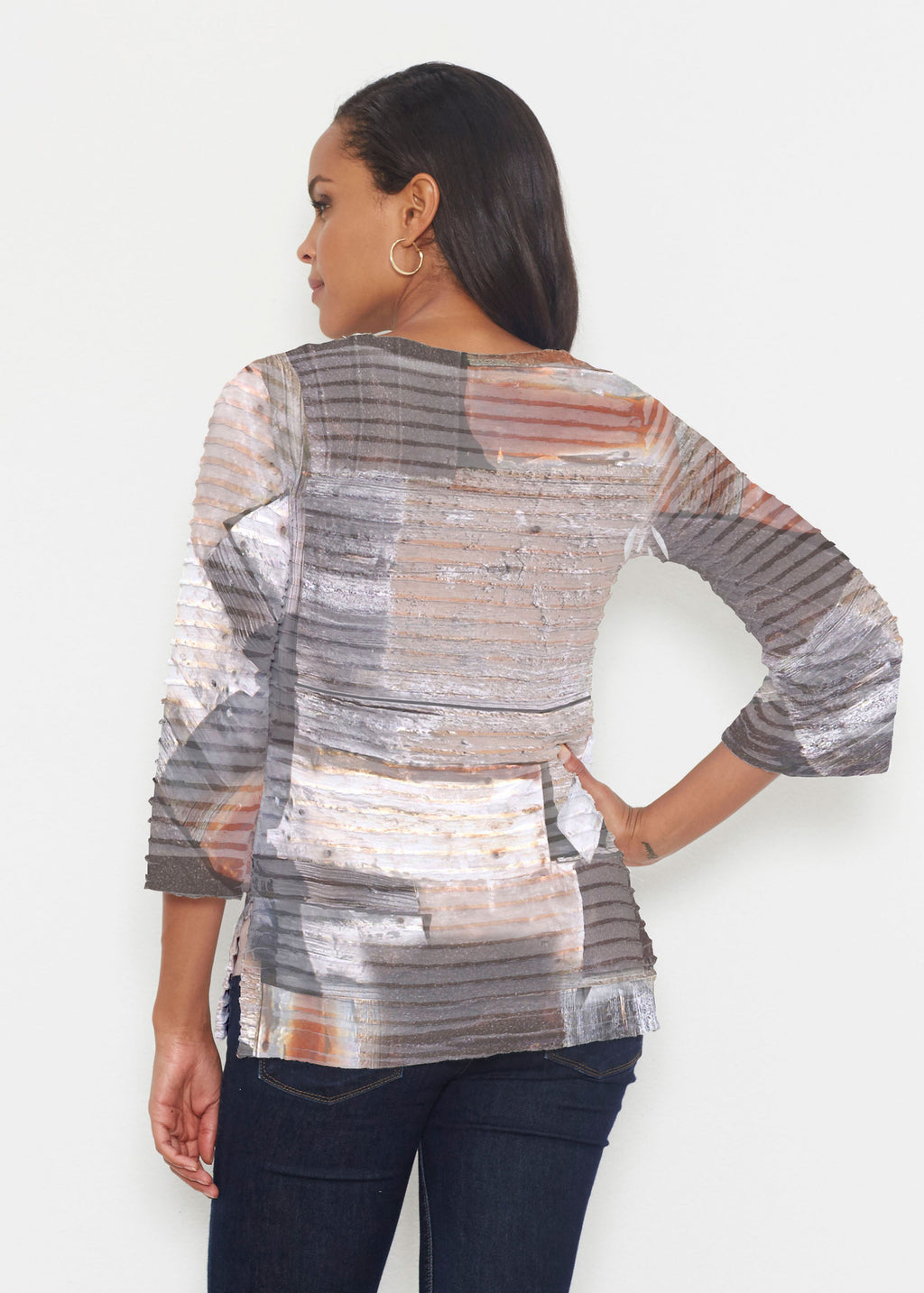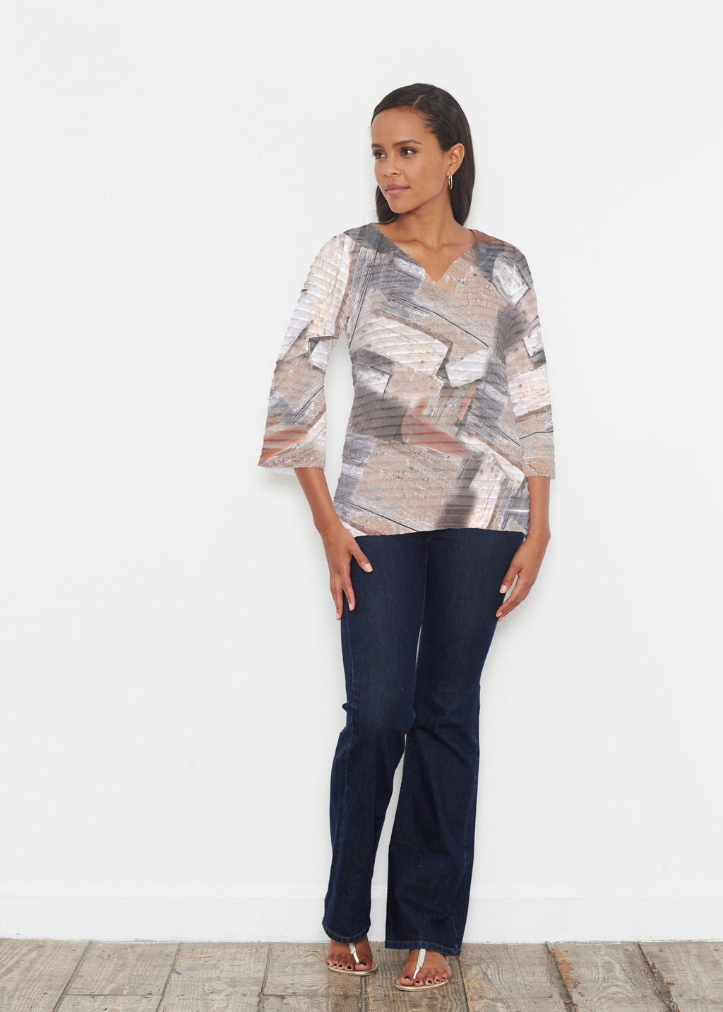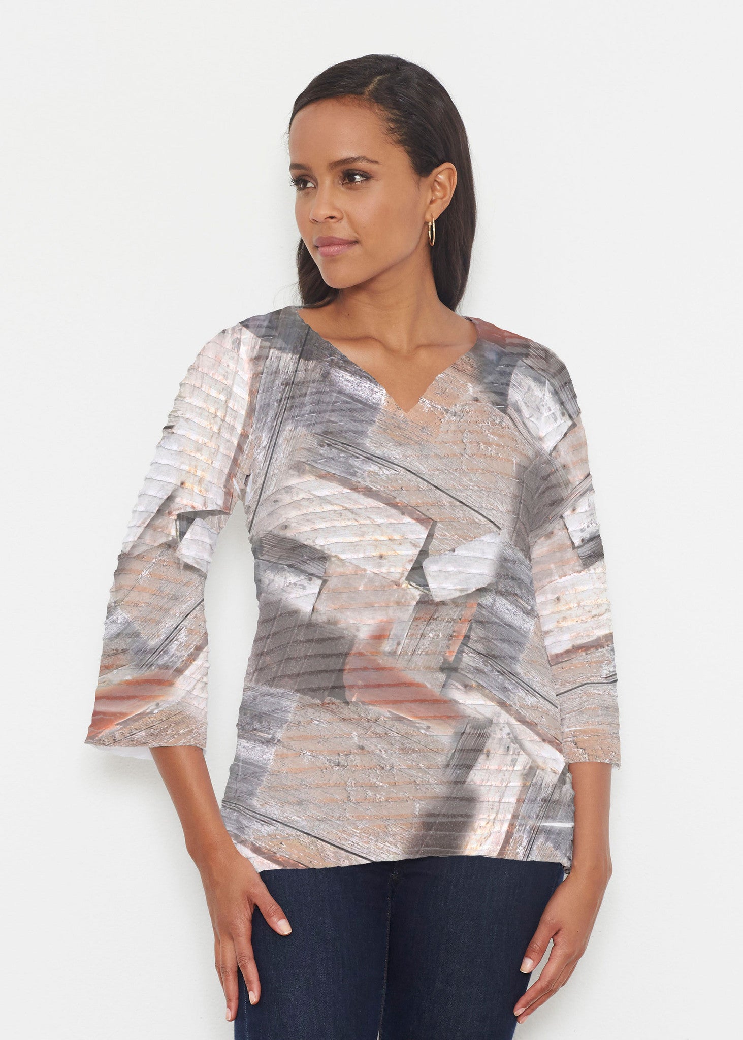 The uniquely soft, pleated texture in this Banded fabric give the 3/4 bell sleeves and sweetheart v-neck a fun and sophisticated look. Flattering side vents adorn the hemline that skims the hip.