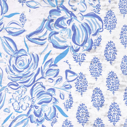 It's a fanciful mix up of summer blooms and a tapestry print in pretty shades of blue.