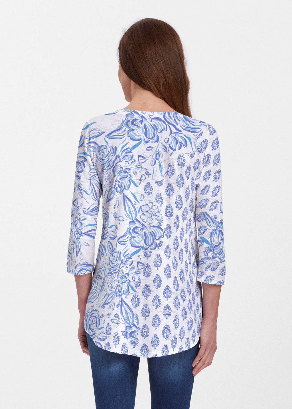 This v-neck tunic in our Signature burnout fabric is forever flattering. 3/4 sleeves and a v-neck flow into a full, swinging shirttail hem.