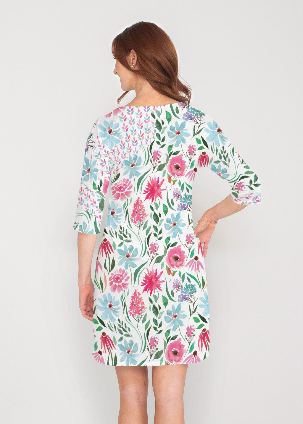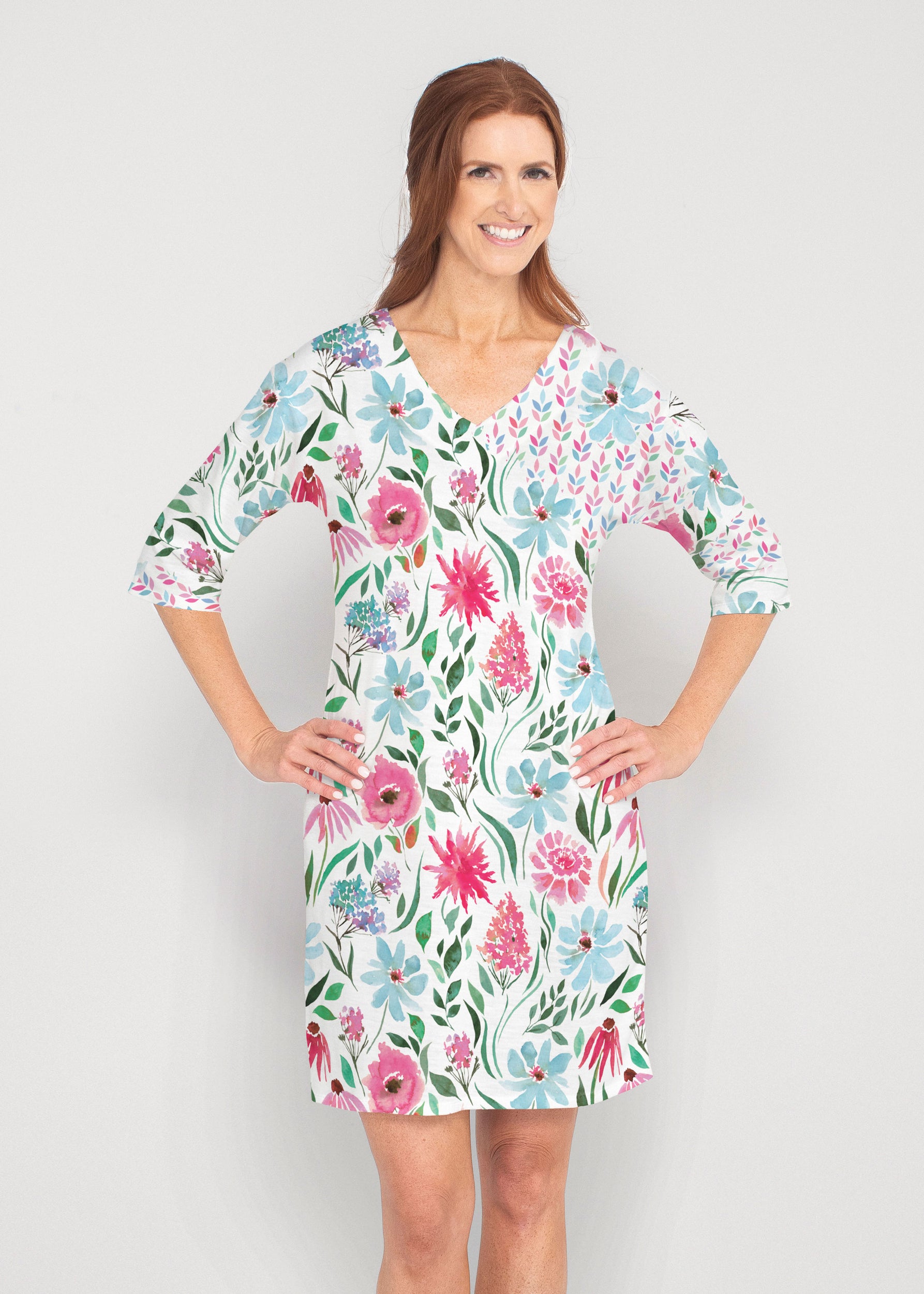 Be comfortable and fashionable all day in our soft Lucy fabric. This v-neck dress features loose 3/4 sleeves, drop shoulders and falls just at the knee.