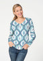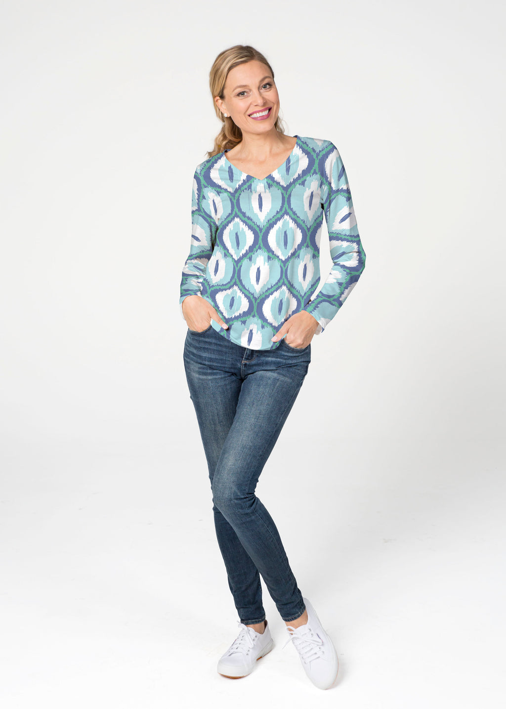 A playful ikat print in shades of blues with green and white and a back panel of our "bud" print in aqua and white.