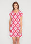 A playful ikat print in shades of pink & red with a back panel of our "bud" print in pink and white.