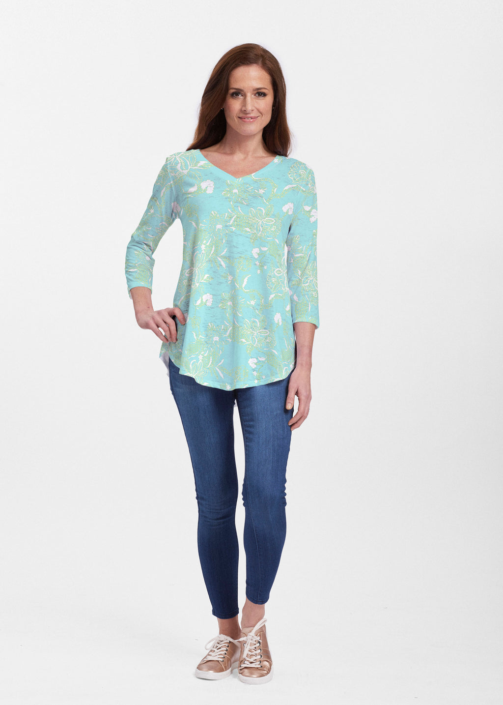 This v-neck tunic in our Signature burnout fabric is forever flattering. 3/4 sleeves and a v-neck flow into a full, swinging shirttail hem.