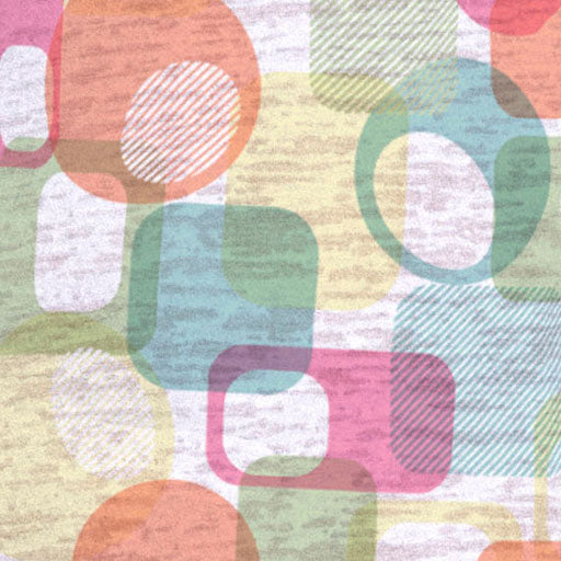 An abstract geo print with three different designs combined into this stunning print with pink, aqua, green and yellow. Designed by Diane Kappa.