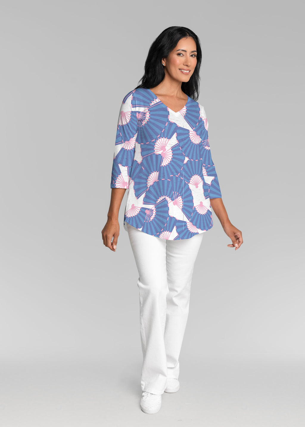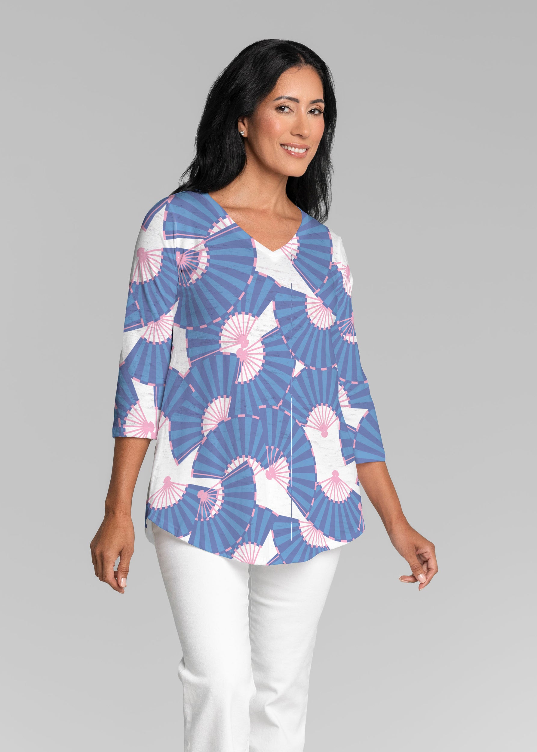 This v-neck tunic in our Signature burnout fabric is forever flattering. 3/4 sleeves and a v-neck flow into a full, swinging shirttail hem.
