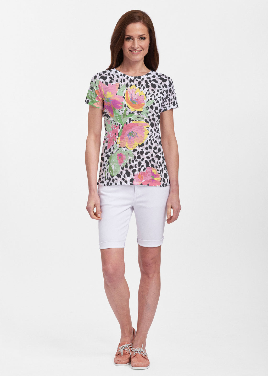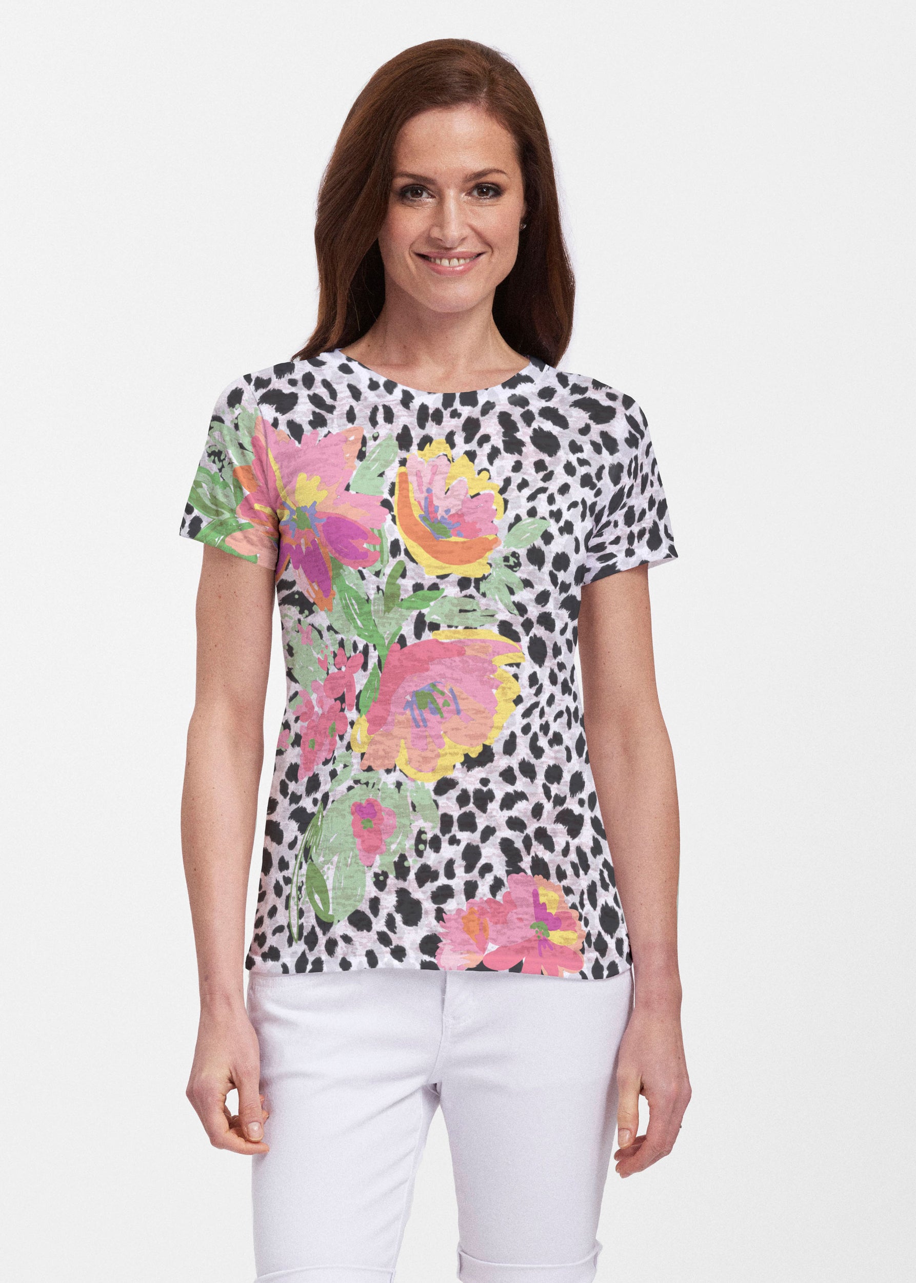 Bring out your wild side in this fun leopard and bright floral print designed by Debra Valencia.
