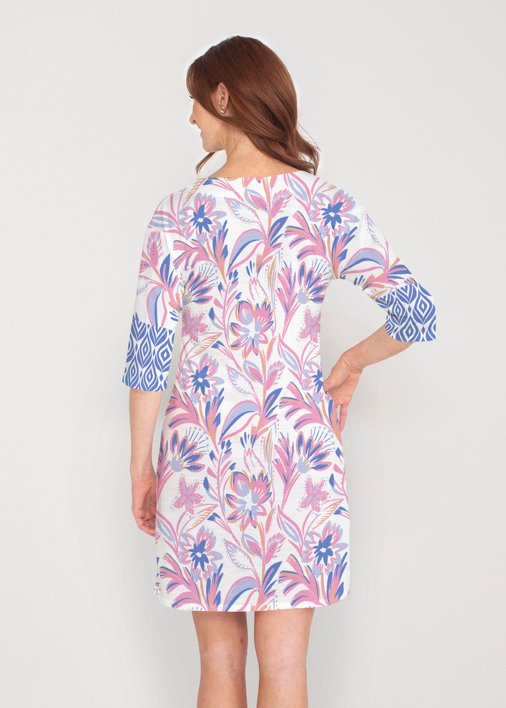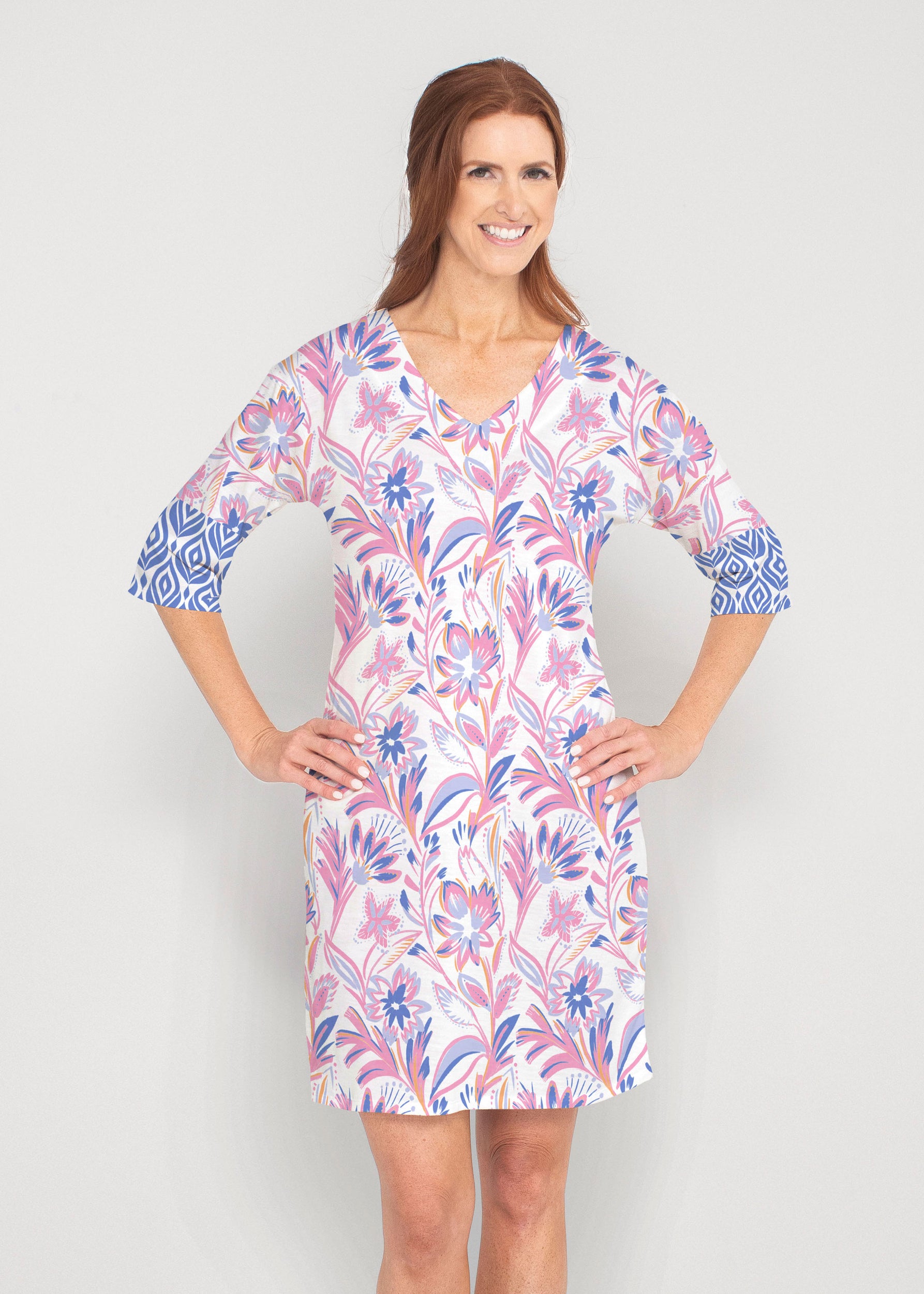 Be comfortable and fashionable all day in our light weight french terry fabric. This v-neck dress features loose 3/4 sleeves, drop shoulders and falls just at the knee.