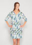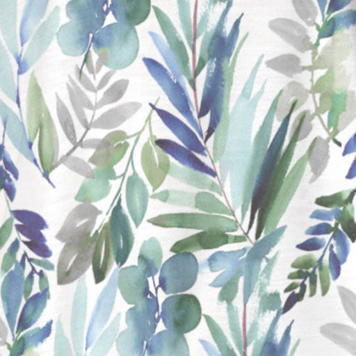 A pop of leafy sprigs in green and pale blues against a navy background with a flip of the print on back with a white background.
