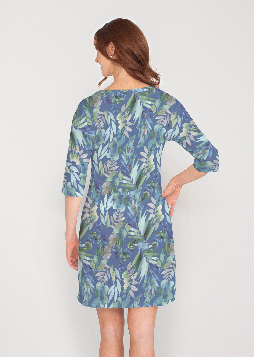 Be comfortable and fashionable all day in our light weight french terry fabric. This v-neck dress features loose 3/4 sleeves, drop shoulders and falls just at the knee.