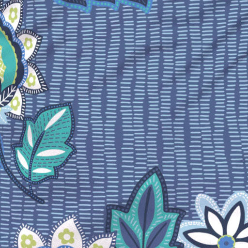 A whimsical design of autumn foliage in blues, greens and lime with a contrasting sleeve print.