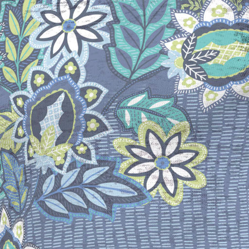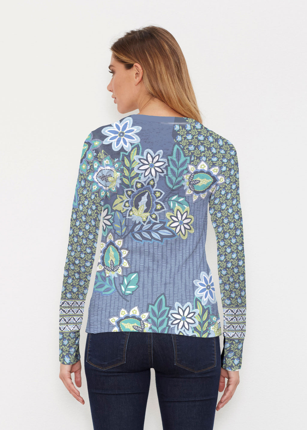 A whimsical design of autumn foliage in blues, greens and lime with a contrasting sleeve print.