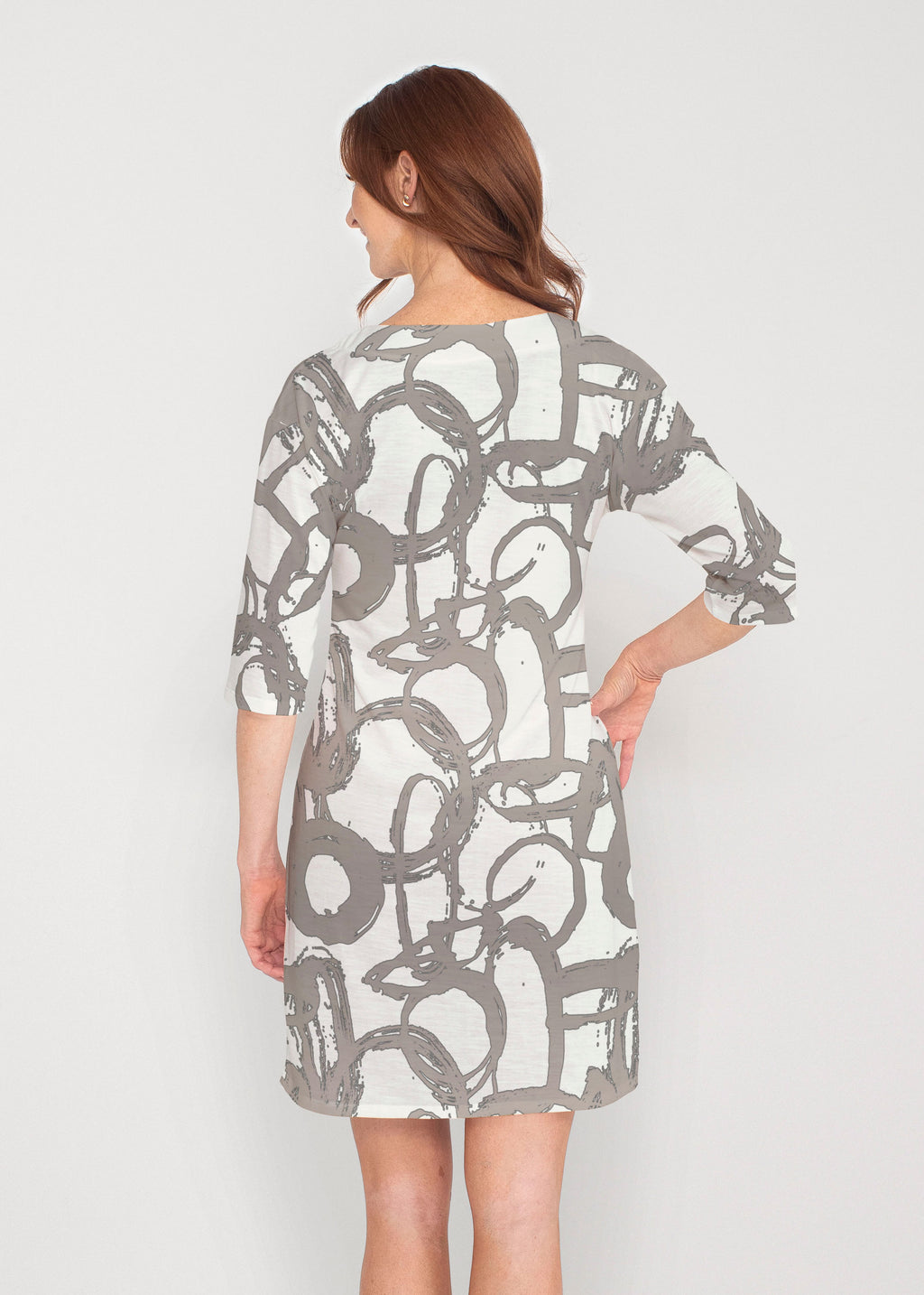 Be comfortable and fashionable all day in our light weight french terry fabric. This v-neck dress features loose 3/4 sleeves, drop shoulders and falls just at the knee.