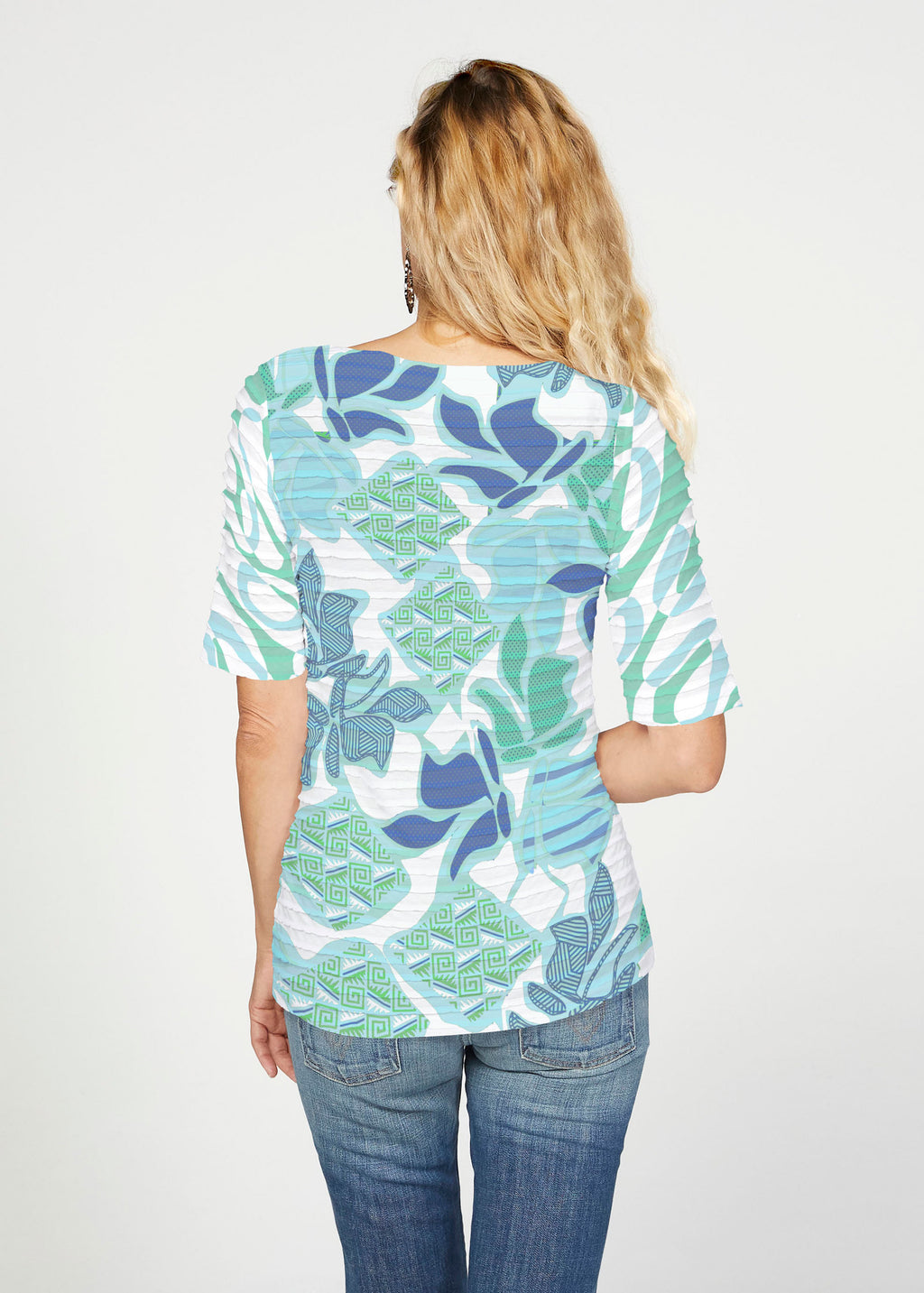 The uniquely soft, pleated texture in this Banded fabric gives the elbow sleeve and boat neck top a fun and sophisticated look. Easy relaxed fit with a hemline that comes below the hip.