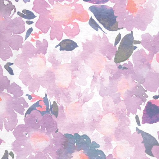 A lovely array of purple and pink watercolor flowers on a white and grey canvas.